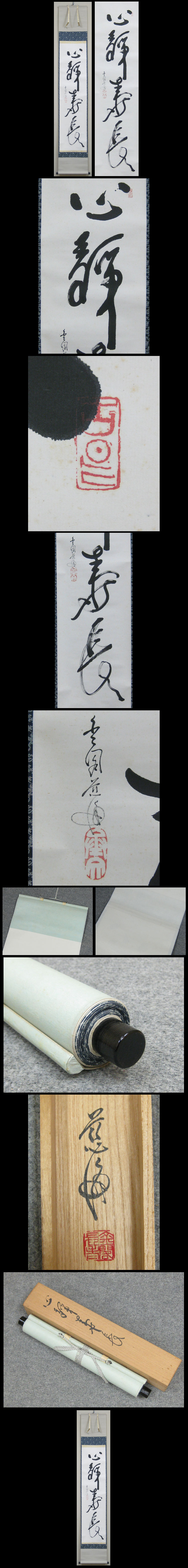 【村上慈海】 明治35年、愛知県に生まれる。大正5年、鹿苑寺にて得度。 大谷大学哲学科を卒業後、天龍寺僧堂で修行。昭和10年、鹿苑寺住職となる。 相国寺派宗務総長、慈照寺特命住職などを歴任し、(財)禅文化研究所理事長に就任。 昭和60年(1985)寂、83才 ★商品サイズ★ ■掛軸 214×36.5cm ■作品 135×34cm ★商品の状態★ 作品に時代のしみ汚れがあります。 裏側に薄じみがあります。 ご承知のうえご入札をお願いします。 時代など詳しくは画像にてよく確認のうえでご検討いただければと思います。 どうぞよろしくお願いいたします。 |