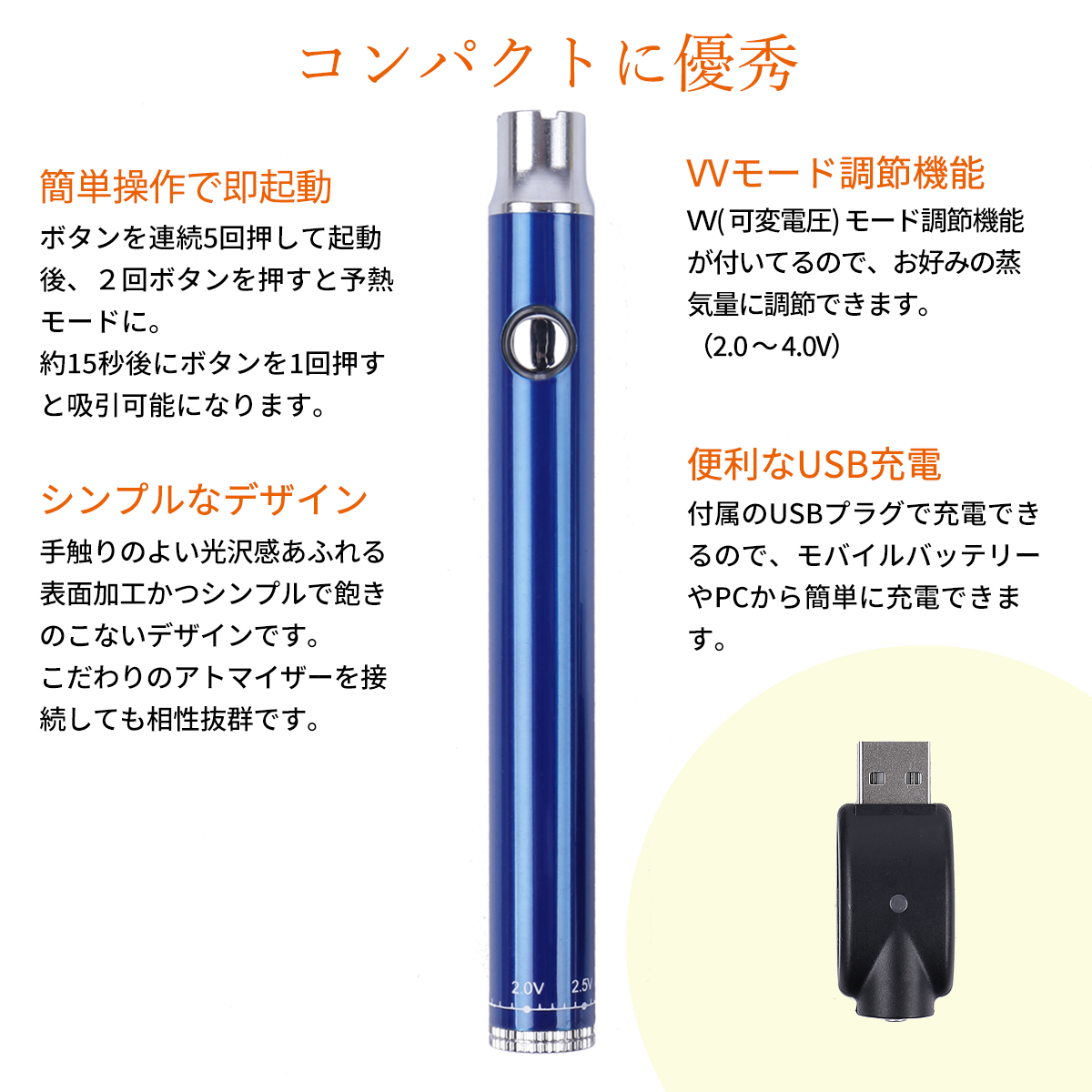 商品仕様 ◆サイズ: 11.2×99mm 、◆適合口金サイズ : 510 規格、◆適応アトマイザー容量: 0.5 ml、 0.8 ml、 1.0 ml ※アトマイザー別売、◆出力電圧(調整可): 2.0 ~ 4.0V、◆バッテリ容量: 350 mAh、◆充電時間 : 2~3時間、◆材質: ステンレス 、◆カラー: ブラック・シルバー・ホワイト・ブルー・レッド (5色展開)、◆パッケージ内容: バッテリー本体、USB チャージャー、日本語説明書