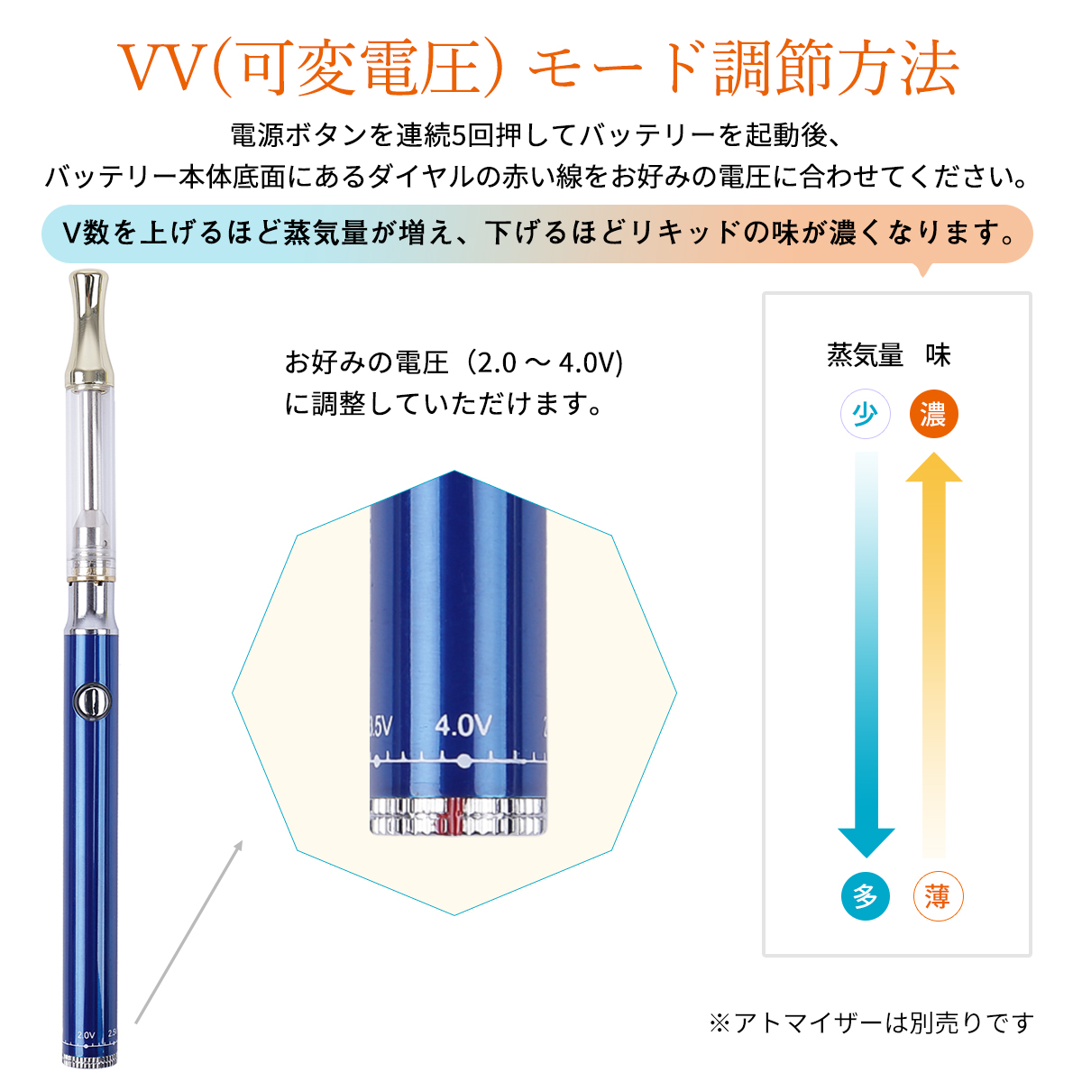 【ダイヤル式電圧調整】VV( 可変電圧『2.0V~4.0V』 ) 機能がついているので、蒸気量や味の濃さをお好みに合わせて調節できます。バッテリー本体底面にあるダイヤル部分の赤い線をお好みの電圧に合わせるだけで誰でも簡単に調節できます。