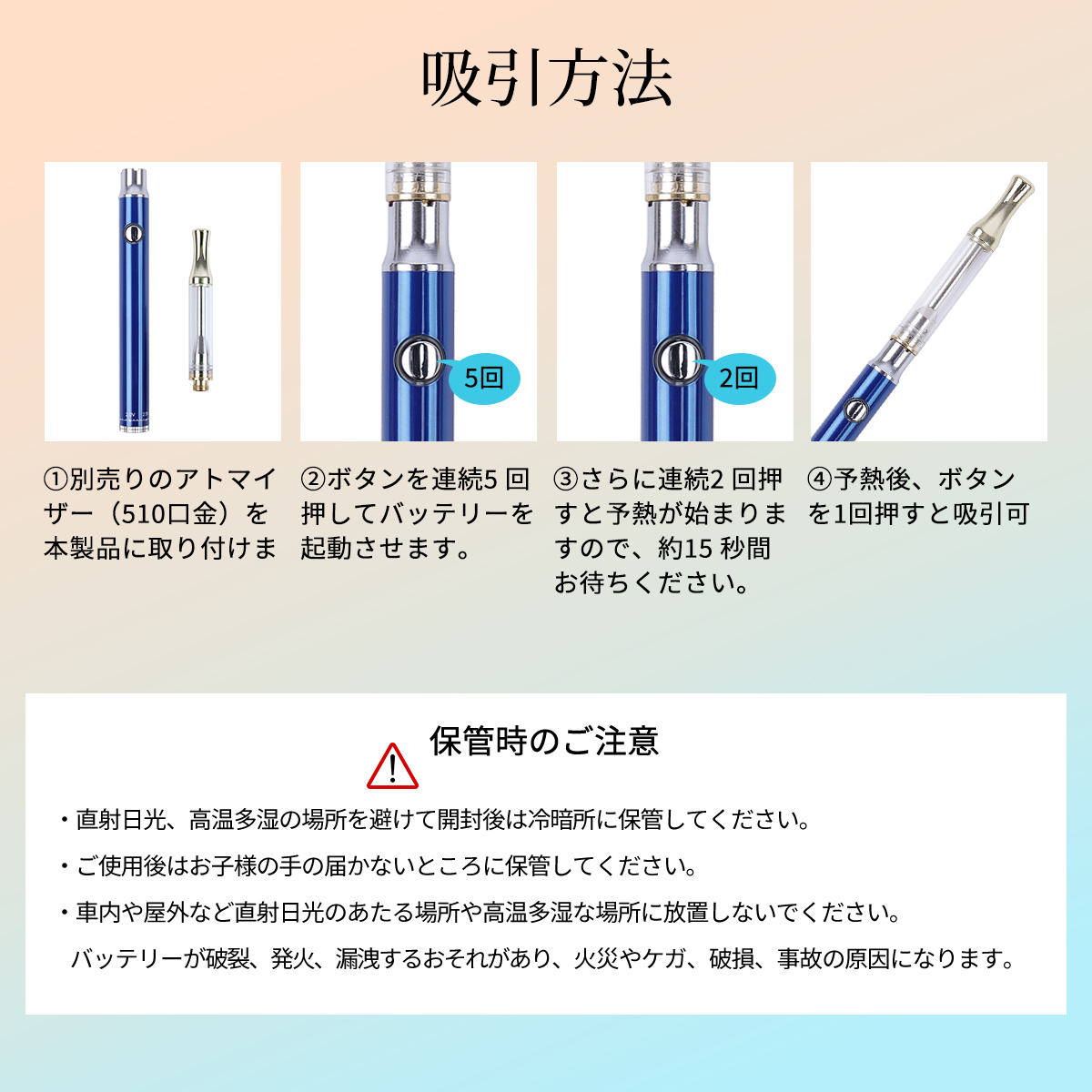 【使用方法も簡単】アトマイザー適合口金サイズは一般的な510規格で初心者も簡単に使用可能。USBで充電し、お手持ちのアトマイザーを取り付け、電源ボタンを連続5回押して起動。バッテリー本体底面のダイヤルでお好みの電圧に設定し、2回電源ボタンを押すと予熱開始。約15秒間待ってから、吸引してください。