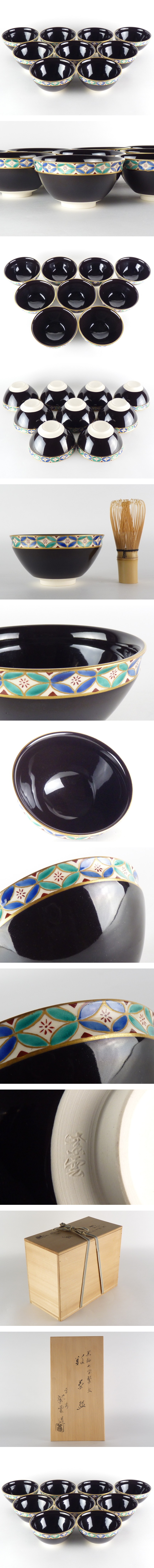 【都屋】平安 橋本紫雲「黒釉七宝繋文数 茶碗」9客 共箱 茶道具 I-3 1127 收藏