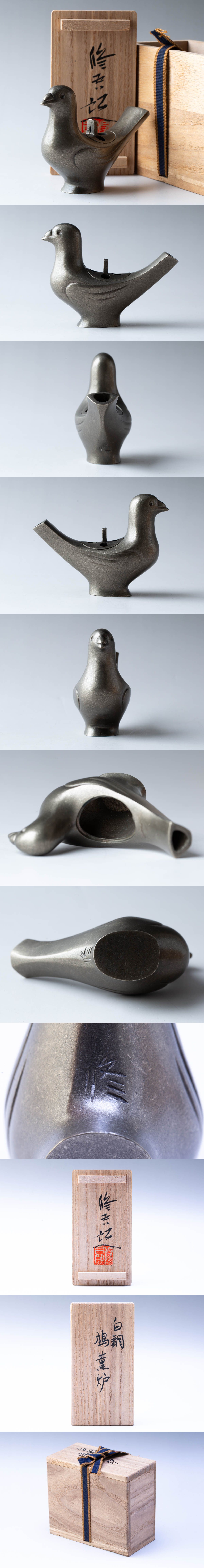 蓮田修吾郎造 白銅 鳩薫炉 香炉 香道具 茶道具 骨董品 銅製 金属工芸 時代物 共箱付 #39045 收藏