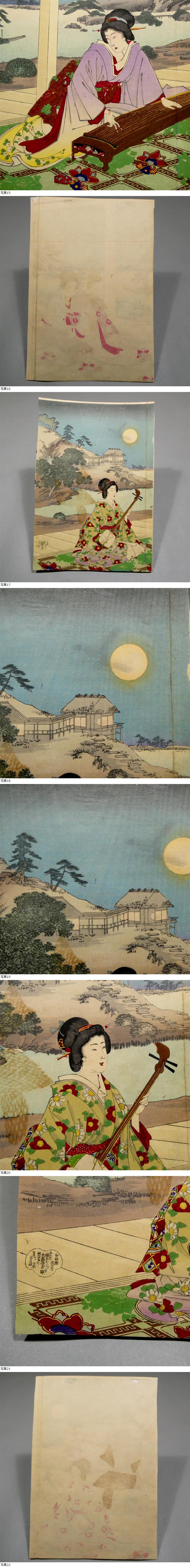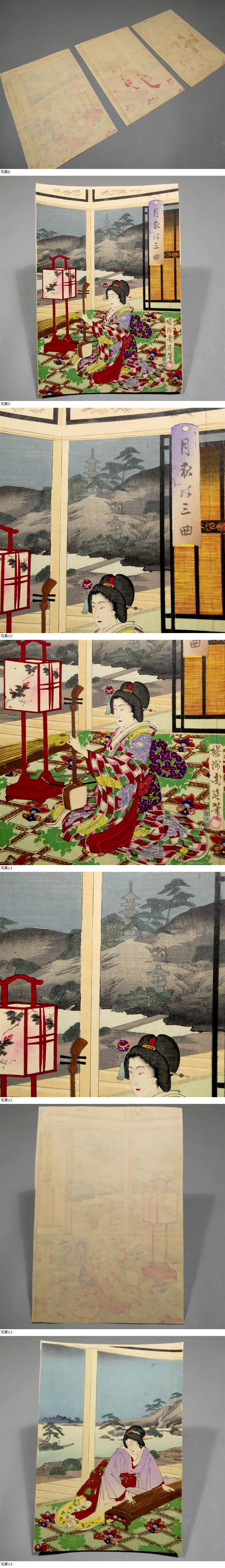 楊洲周延◆明治時代 木版浮世絵◆「月夜の三曲」3枚続揃い◆池泉庭園の雅な音色 二胡 琴 三味線■江戸浮世絵の再来 美人画■国貞 芳年 20 收藏
