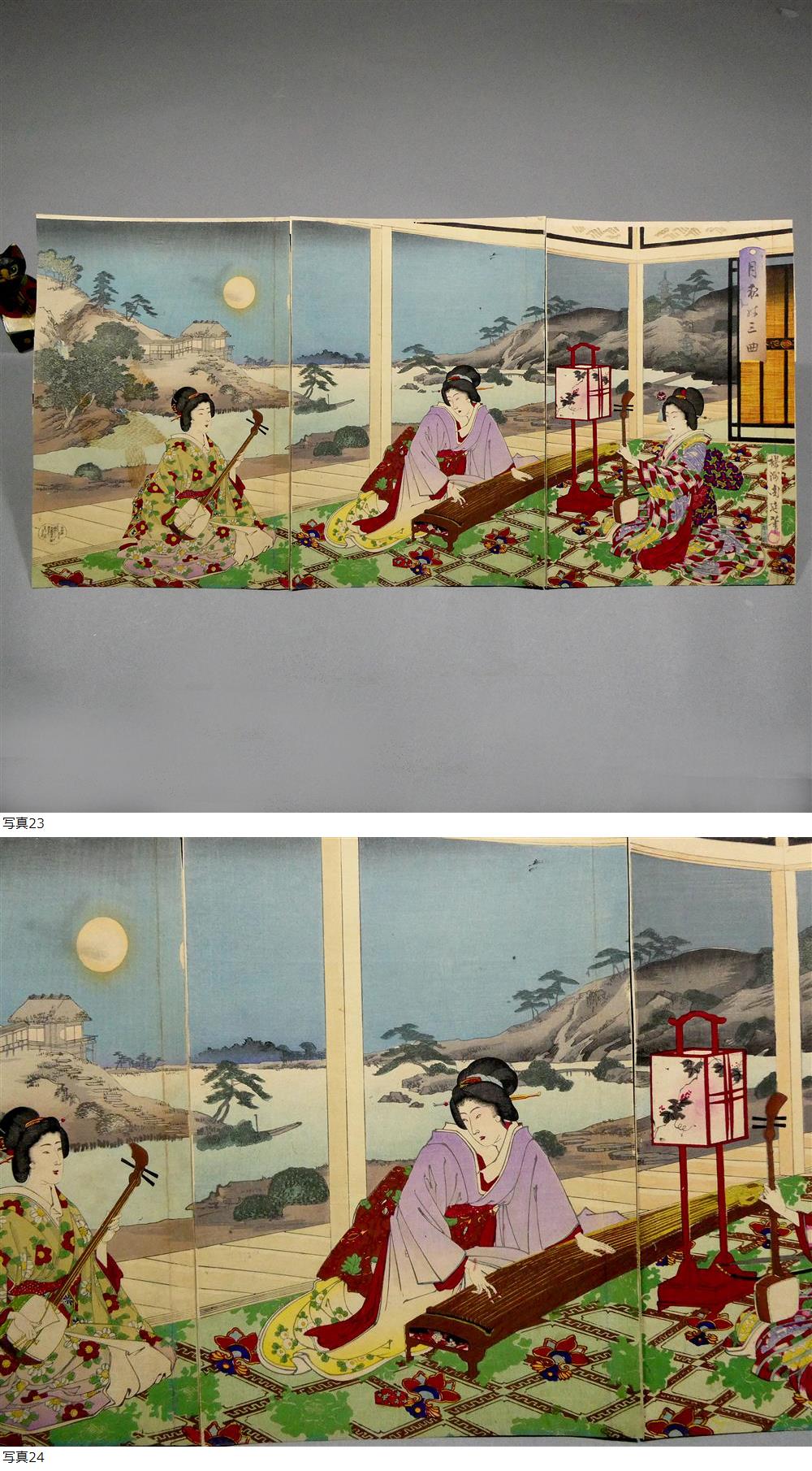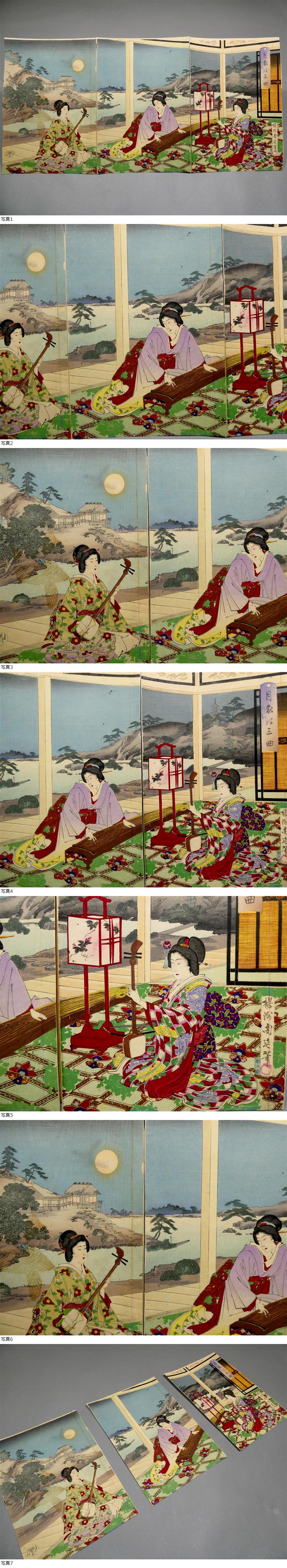 ■ 楊洲周延 明治時代 木版浮世絵 「月夜の三曲」3枚続揃い 池泉庭園の雅な音色 江戸浮世絵の再来 ■