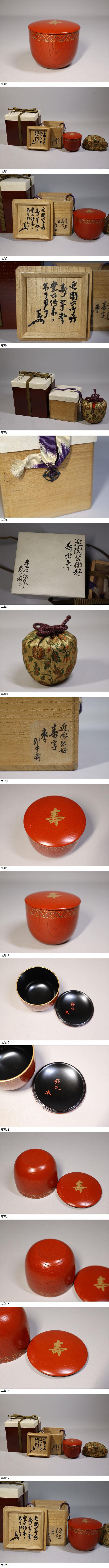本物保証。状態良好で綺麗です。近衛公好寿字棗 即中斎書付 豊臣秀吉公伝来之朱を以て 五摂家 近衛文麿です。次第も見事で素晴らしい仕立てです。
