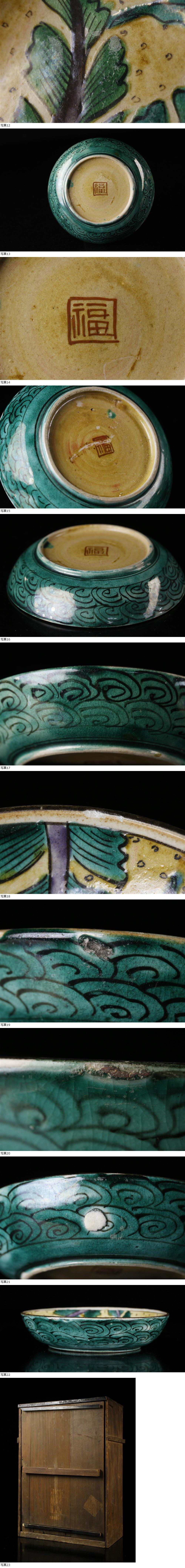 26010905 A* * * 商品詳細 * * * ここでしか出逢うことのできない唯一の美をご紹介させて頂きます。 力強く鮮やかな色絵が目を惹く古九谷 青手 万年青文皿 十客揃のご紹介です。 力強い筆致と、重厚感のある五彩が映える逸品で、 中央には繊細かつ大胆な万年青文が生き生きと描かれ、 限られた空間の中で豊かな表現を生み出しています。 裏には「角福」銘が刻まれており、古美術としての格式を感じさせます。 職人の高い美意識と技術力がうかがえます ■商品内容/皿十客、時代箱 ■サイズ/横12cm×縦3cm 箱:横30.5cm×縦41cm×奥行17㎝ ■状態/経年による傷み、スレ、傷、小さな欠けが数ヵ所、釉薬に剥げ、 箱にスレ、傷、割れ、欠け、シミ、パーツ外れがあり、蓋の閉まりが悪くなっています。 ※写真にてご確認、ご了承の上ご入札下さい。 * * * 支払詳細 * * * !かんたん決済 * * * 発送詳細 * * * 入金確認後3営業日以内に発送致します。 ※直接引き取りも可能です。 60~160サイズにつきましては 佐川急便、ゆうパックのどちらかで発送いたします。 ゆうパック発送の場合、弊社の発送日から追跡サービスに問合せ番号が反映されるまで 約1日ほどお時間がかかりますのでご了承下さい。 * * * 注意事項 * * * 運送中の破損があった場合は速やかに当社までご連絡下さい。 保険を利用するのに受取連絡後に運送会社による現場での破損状況確認が必要となります。 勝手に返送されますと保険の適用外となりますのでご注意ください。 * * * * * * お問い合わせ:082-236-8669 |