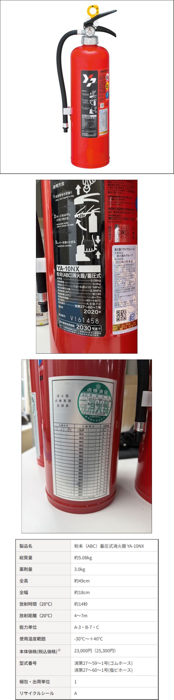 | 商品説明 | ▼商品詳細 ■メーカー:ヤマトプロテック ■製品名:粉末(ABC)蓄圧式消火器 YA-10NX ■サイズ:幅180mm/高さ490mm ■状態:★★★★☆ ※2020年製造 標準使用期限2030年 ※ご使用の端末により画像の色と実物の色の見え方が異なる場合がございますがご了承ください。 ※公式HPの仕様書を載せてございます。詳細はこちらをご覧ください。 ■配送、保管期間につきまして 陸送限定のため到着に日数がかかる場合がございます。 同じ理由で北海道・沖縄には送ることができません。 発送ではなく、店舗まで直接お受け取りに来て頂く事も可能です。 下記営業時間内でご予約を入れいただいてのお引き取りになります。 落札後1週間は無料で保管が可能です。 それ以上の保管につきましては別途費用が発生しますのでご相談ください。 ■お問い合わせについて 埼玉県三郷市戸ケ崎2-794 048-948-2180 月曜日~金曜日 10:00~18:00 土日祝は営業しておりませんのでお引取り、取引ナビ、お電話などご対応が出来ません。 |