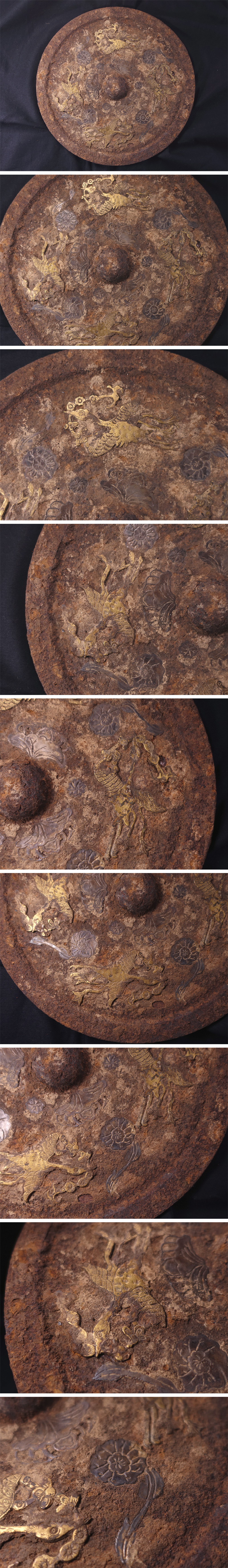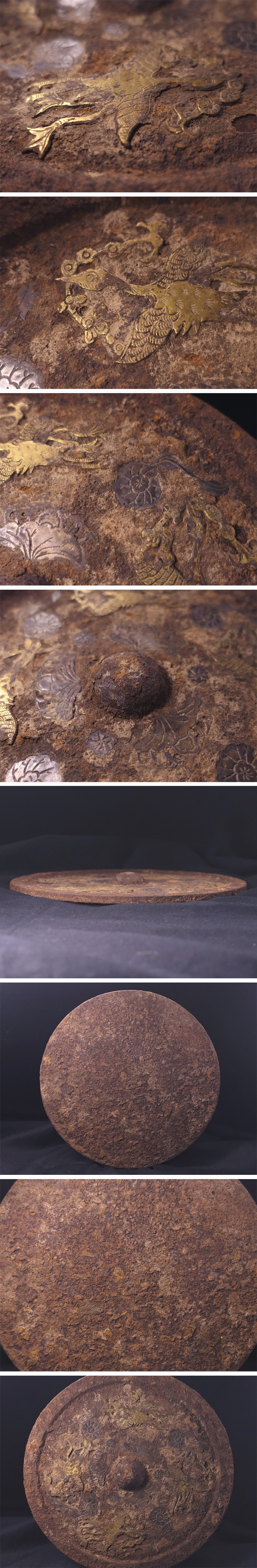 ∇花∇中国高古銅器 唐時代か 金銀錯嵌四鸞銜綬鏡文鉄鏡 面径25.5cm 大変希少な鉄鏡!超入手困難! 発掘出土品 收藏