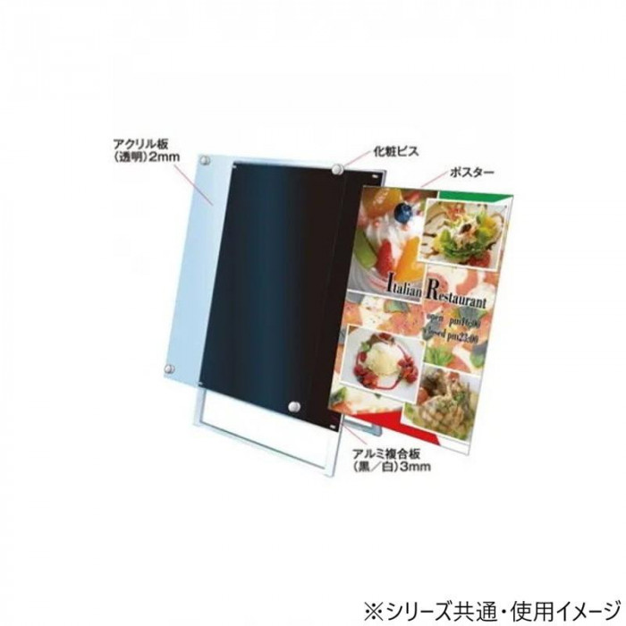 | アクリルと化粧ビスでポスターを挟み込んで、展示することができます。高級感あるスタンド看板です。 |