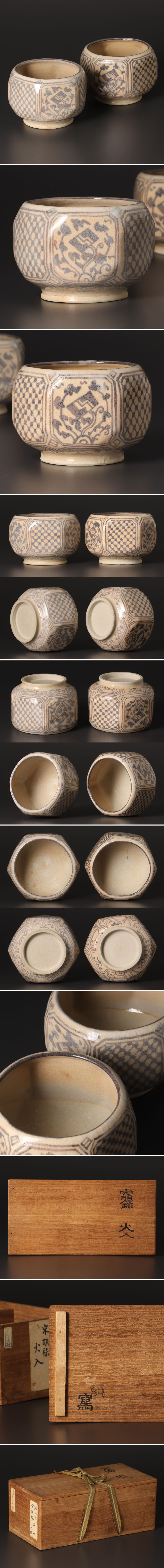 柔らかなベージュの地肌に、幾何学的な文様や草花文が美しく映える宋胡録写の火入一対です。手馴染みの良い六角形のフォルムと、表面を覆う繊細な貫入が、時代を経たような渋い趣を醸し出しています。 落ち着いた色調は和の設えに自然に馴染み、火入としてはもちろん、香炉やインテリアとしても愉しめる趣深い逸品です。目立った傷もなく状態は良好です。お手元のコレクションとして、ぜひこの機会にご愛用ください。 ★商品は大野鈍阿の作品である事を保証致します。 |