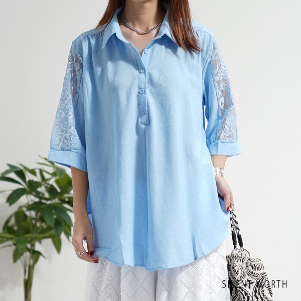新品 サックス SILENT WORTH サックス レース袖 シャツ チュニック M レディース ゆったり Aライン 体型カバー 春 夏 秋 ブラウス 收藏