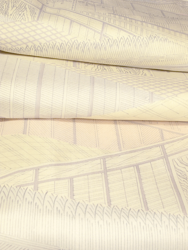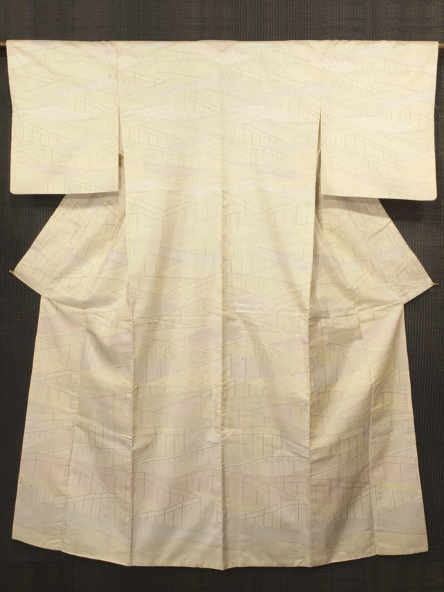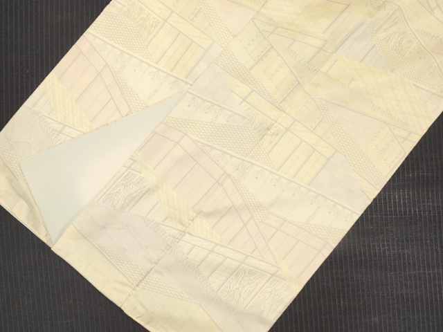 ごく淡い淡黄(たんこう)色の地に、御所解きの文様が染められている、大島紬です。袷仕立てです。 淡くはかなげで、かわいらしさのあるお色目なので、お顔の色を明るく見せられそうです。御所の御簾(みす)や竹垣、檜垣(ひがき)などが幾何学的な趣で寄せられていて、モダンなおもしろみが感じられる意匠です。帯合わせでは物語性のある装いもできそうです。さらりとした手ざわりの大島紬らしい地風です。 一部しつけの残った仕立て上がり未使用保管品です。右後身ごろの裾上約 30cm に直径約 1mm の色飛びが 1 か所ありますが、目にはつかず、気にはなりません。淡いお色目なので、経年による若干のくすみなどはあるかもしれませんが、とくに判別はつきません。そのほかに目につく大きなしみやよごれ、褪色などのダメージはなく、全体的にはとてもきれいな状態です。 |