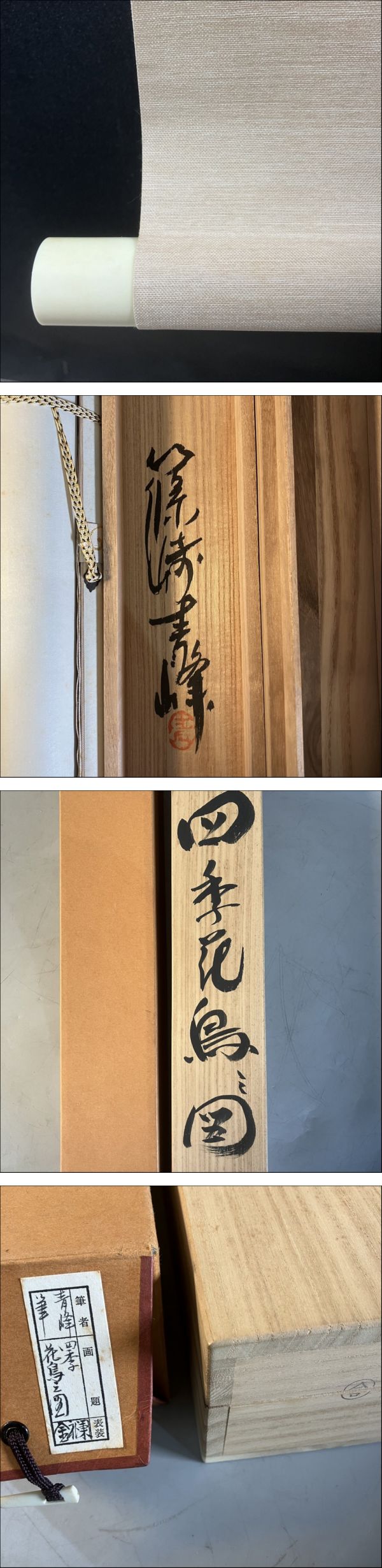 | L2-058 青峰筆 四季 花鳥之図 絹本 掛軸 在銘/落款 共箱入り 約W55/H183㎝ | ||