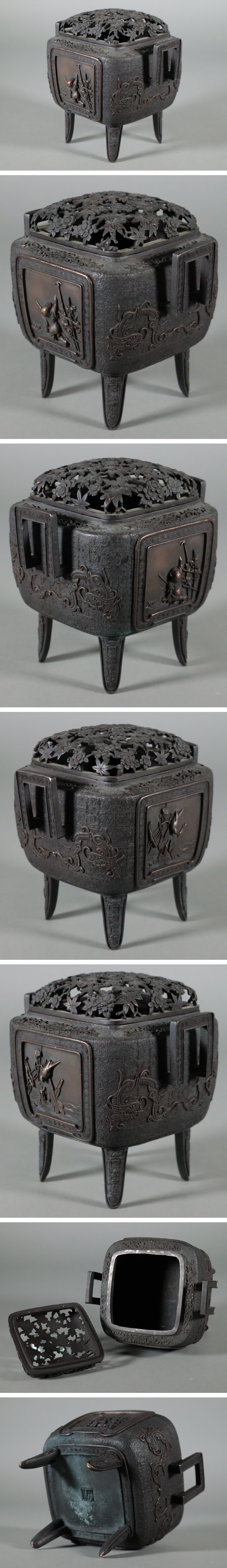 富山県 高岡市 伝統工芸 高岡銅器 金工師 芳山 / 間垣花鳥香炉 / 古銅 銅製 高肉彫 人物花鳥図 双耳 四足 香炉 / 香道具 香爐 骨董品 收藏