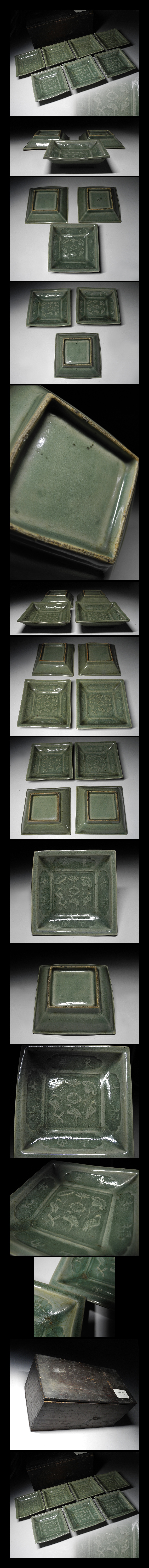 緑屋i■ 時代物 三田青磁 蓮鳥紋陽刻 角皿 7点 木箱 幅約13cm 天龍寺青磁写 古陶磁 i9/0107-6/22-4#80 收藏