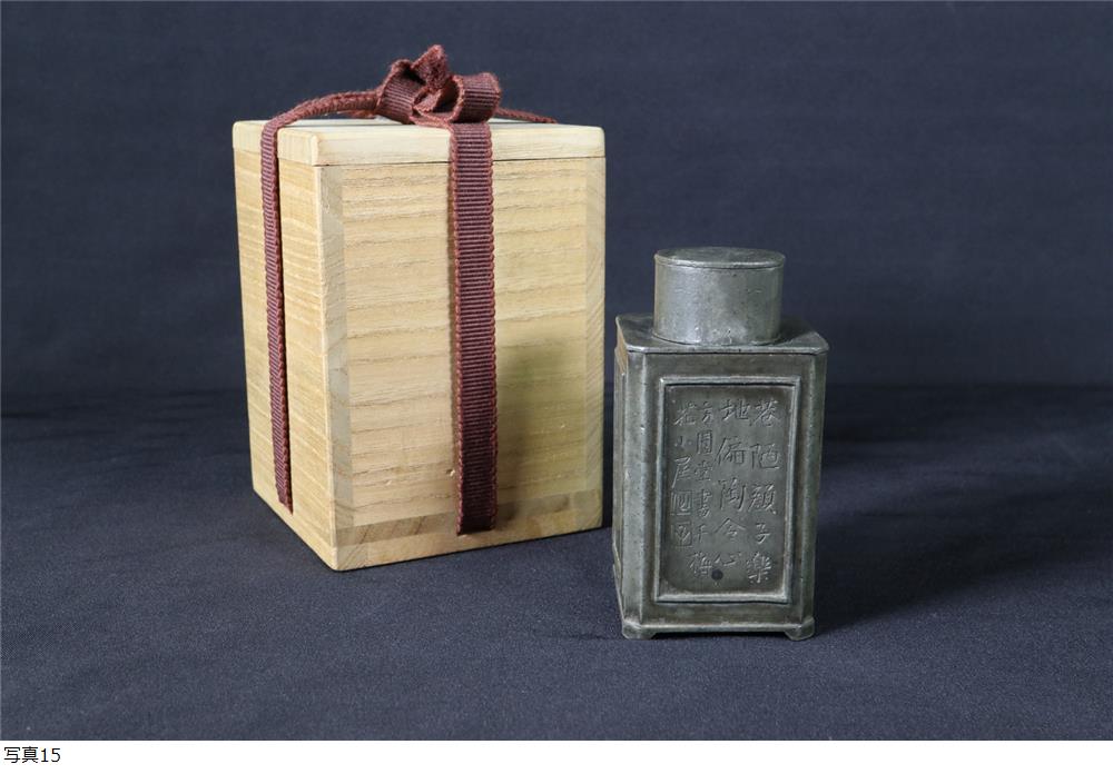 | 沈存周(号 仙子)刻 王東文造 古錫 詩文花草図 茶入 時代 茶壺 唐物 茶心壷 煎茶道具 木箱付き |