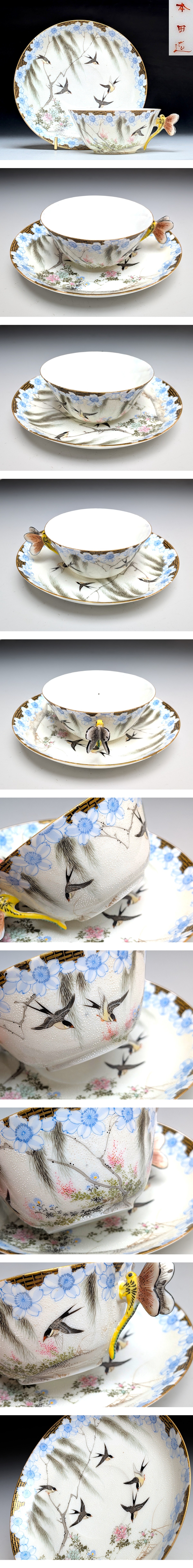 | オールドニッポン 本田造 卵殻手 白釉点 燕図 バタフライハンドル カップ&ソーサー | ||||