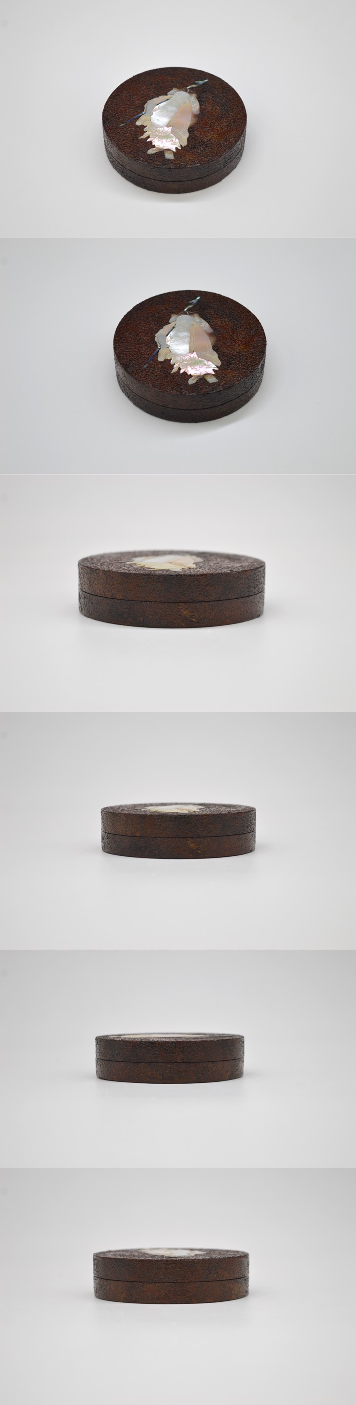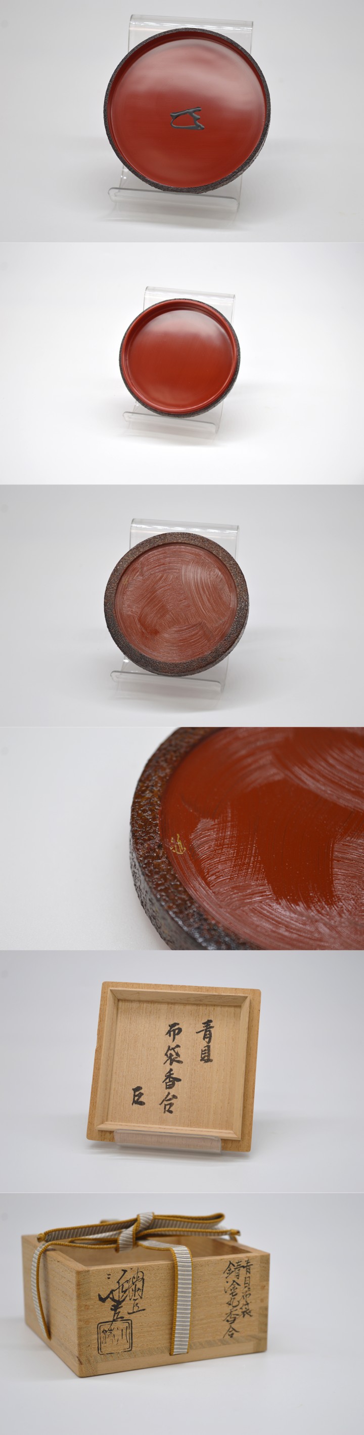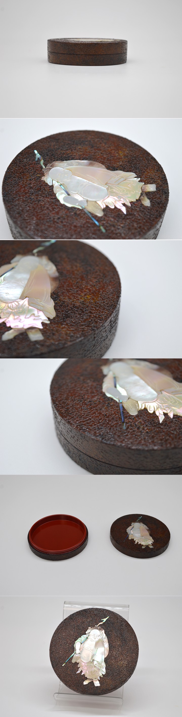 【商品名】 五代 川端近左 青貝布袋錆塗丸香合 而妙斎箱書 【サイズ】 胴 約8.7cm 高 約2.4cm ※若干の誤差はご容赦ください。 【状態】 無傷 五代川端近左による、青貝布袋錆塗丸香合です。 錆塗の落ち着いた地に、青貝を用いた布袋図をあらわし、 小品ながら格調と遊び心を兼ね備えた雅味豊かな作行きです。 蓋裏の朱漆との対比も美しく、 香合としての実用性はもとより、鑑賞性にも優れたお品です。 而妙斎箱書を備え、取り合わせも整っております。 当社が出品している商品は直接ご覧になることも可能です。 下記までメールにてご連絡いただけましたらご用意致します。 info@sagami-ya.com ※当社が扱っております品物は古美術品となりますので、 神経質な方はご入札をお控えください。 ※商品写真をご覧になるモニター環境等により、 実物と色合いが異なる場合がございます。予めご了承ください。 |
