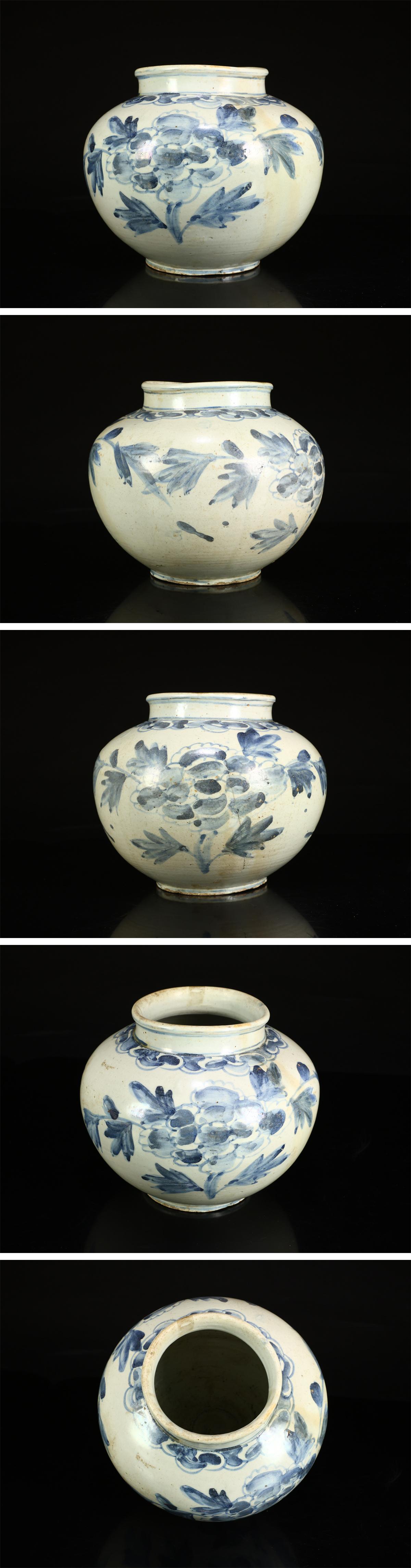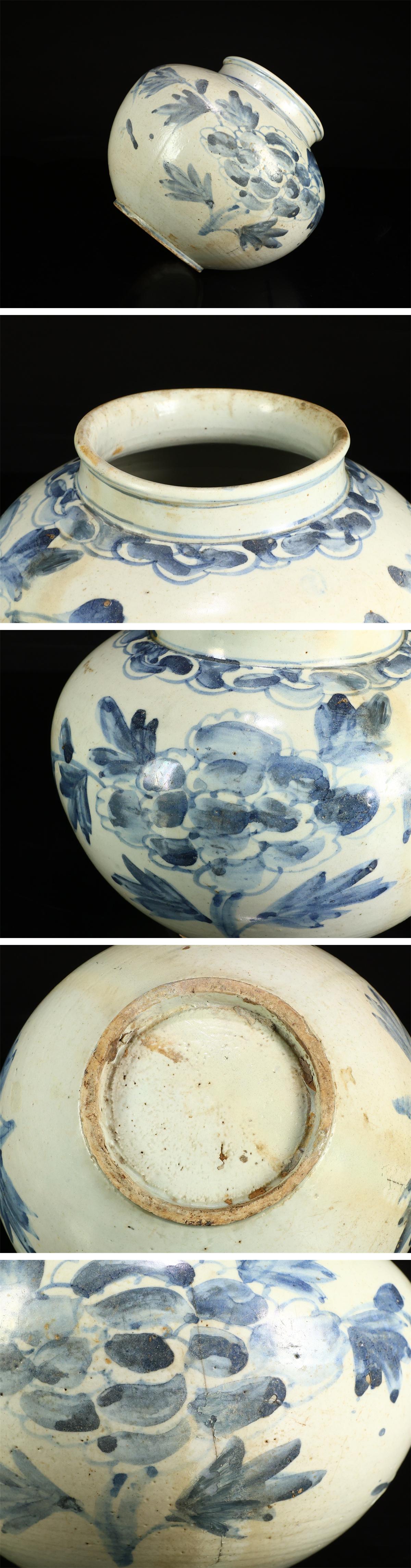 【吉】CQ102 【李朝時代】 染付青華牡丹文 壷 高18.5㎝ 径23.4㎝/時代のなおしあとありNg! 收藏