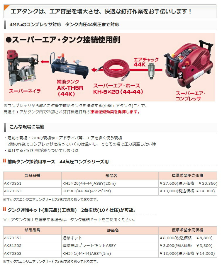 マックス MAX高圧接続エアタンクAK-TH5R(44K)■特長・4MPaのコンプレッサ対応 タンク内圧44気圧まで対応※コンプレッサから離れた位置で補助タンクを接続する(中間エアタンク)ことで、高温のエアがタンク内で冷却され釘打機連打時の凍結低減効果を発揮します。■仕様・商品品番:AK94985・高さ(H)×幅(W)×長さ(L):282x141x509(mm)・質量:3.0kg・タンク容量:5L・減圧弁の圧力調整範囲:0.1~2.45MPa・タンク内最高圧力:4.3MPa・エア取出口:スーパーネイラ専用エアチャックワンタッチ式(2個)・エア取入口:エアプラグAK-TH5R(44K)・AK-TC5R(44K)には、エアコンプレッサとの接続ホース・専用カプラは装備しておりません。■注意事項2連・3連接続時は必ず専用連結ホースをご使用ください。・エアタンク内の圧縮空気がすべて排出されていることを必ず確認してから連結ホースを脱着してください。・2連接続・3連接続でご使用の際は20A以上の電源からそれぞれ分けてお取りください。