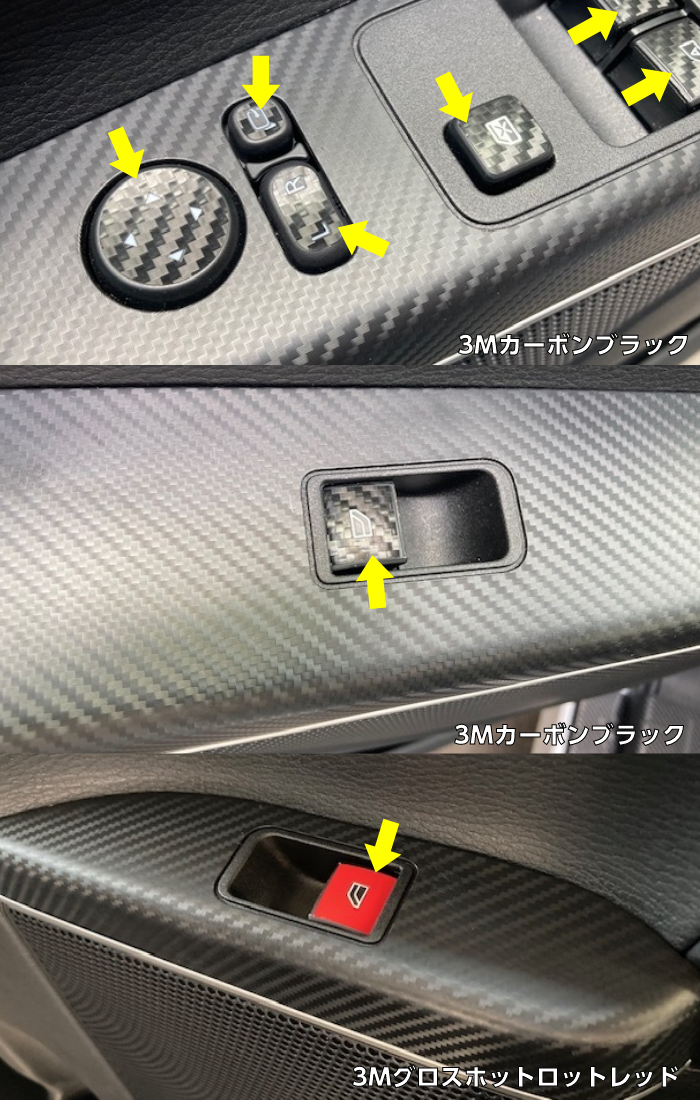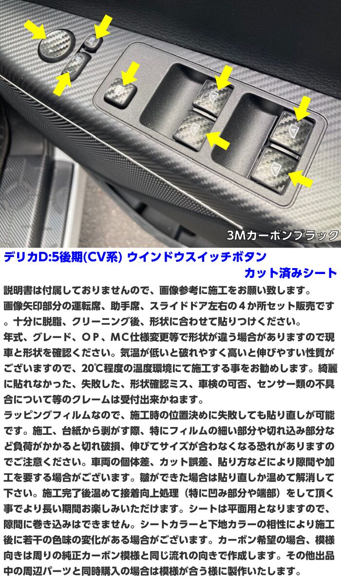 3Mシート使用ウインドウスイッチボタンカット済みシート 運転席、助手席、スライドドア左右の4か所セットの販売です。 施工完了後は温めて接着向上処理してください。処理が甘いと浮きや剥がれの原因となります。 MC.OP.グレード、仕様変更等で形状が違う場合がありますので現車をご確認ください。 ★材質:ソフト塩ビ ★屋外約2-3年(メーカー値、使用環境、シートの種類による)