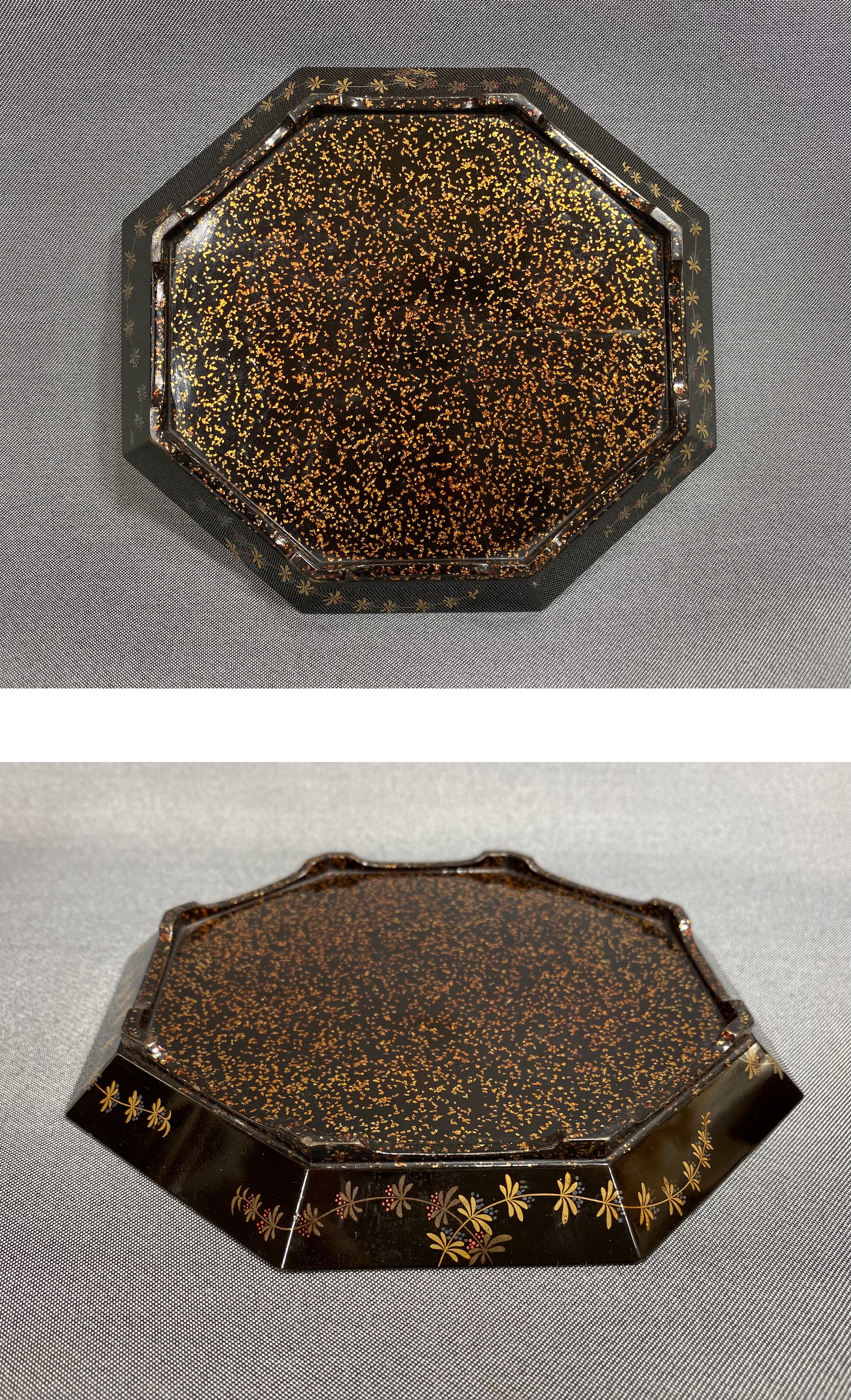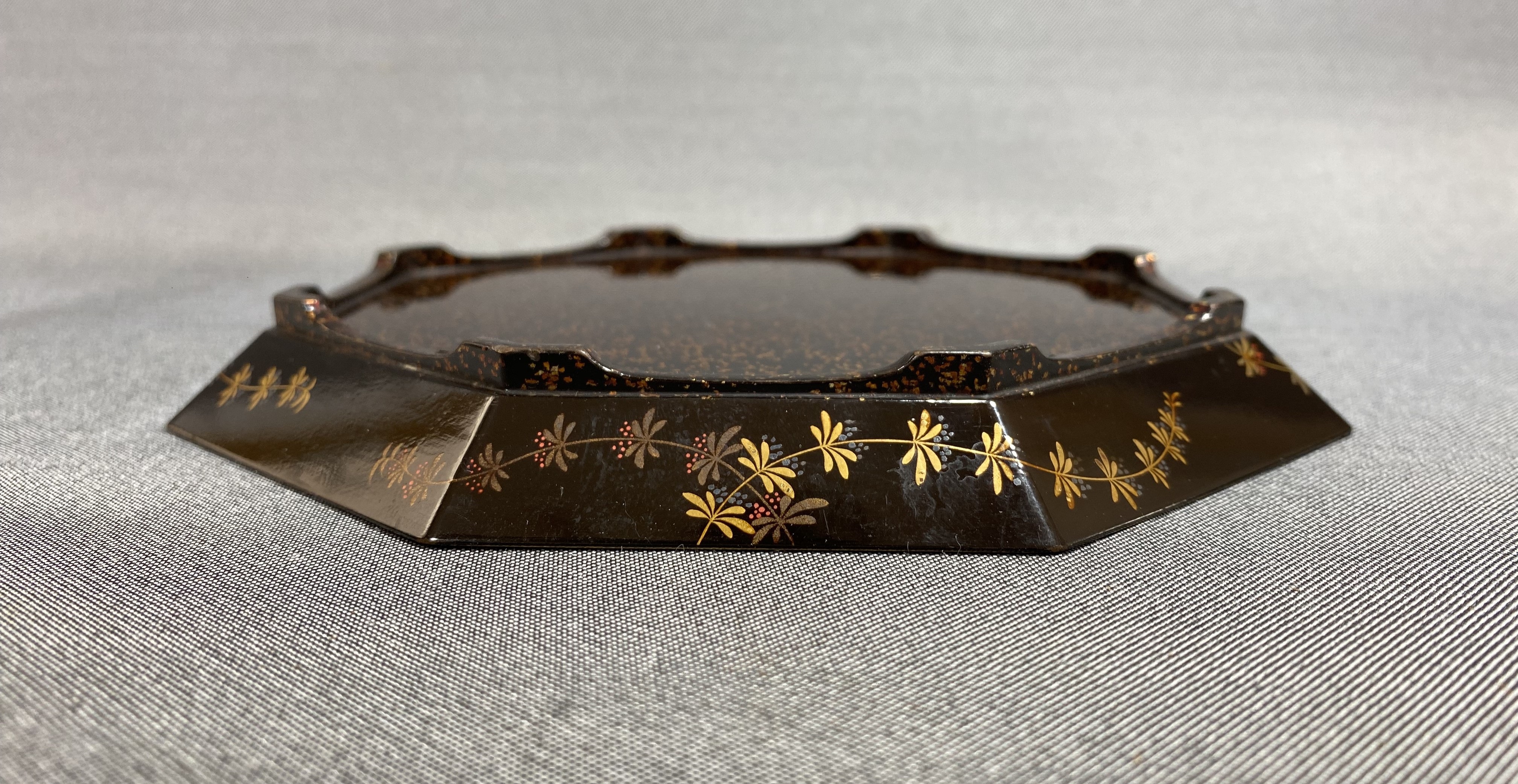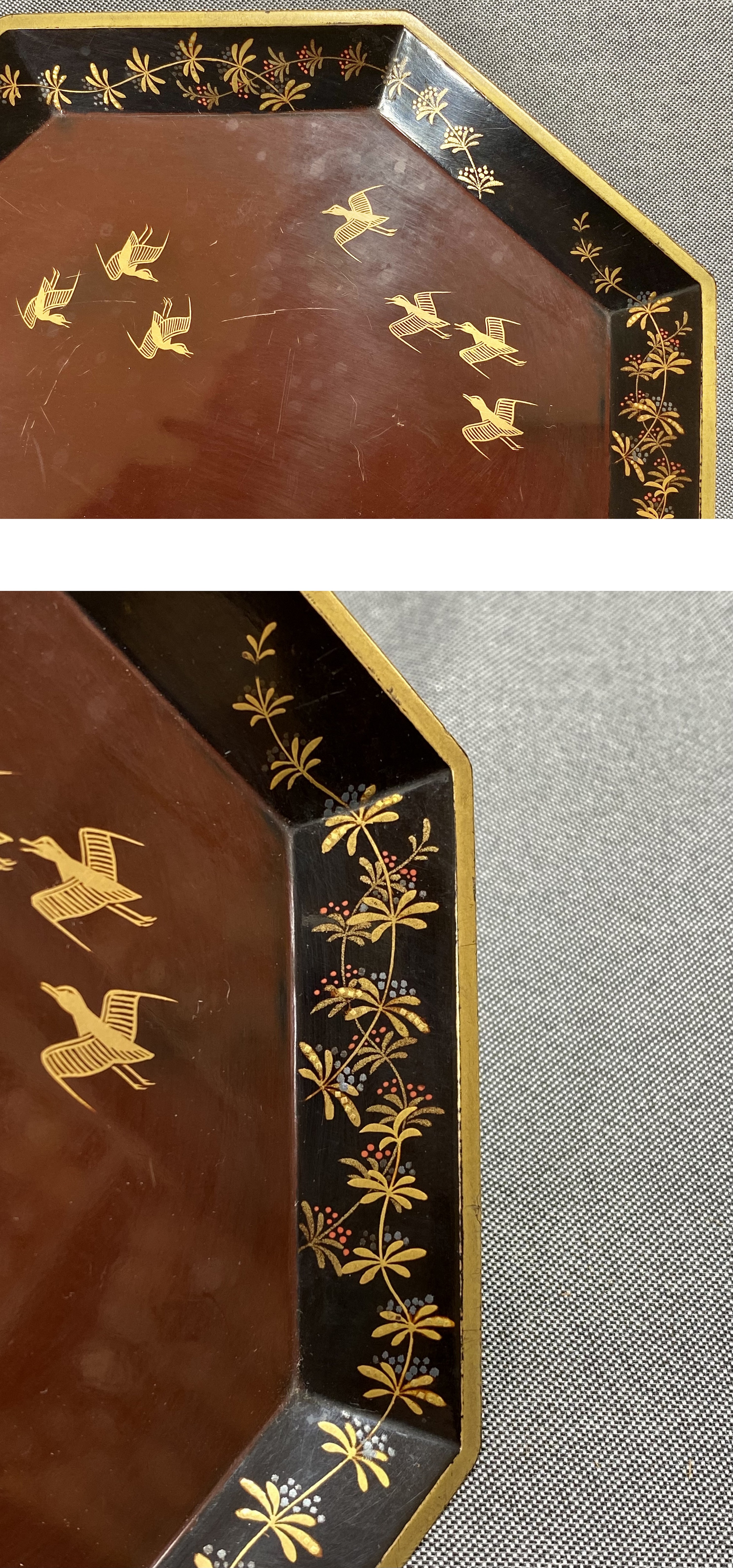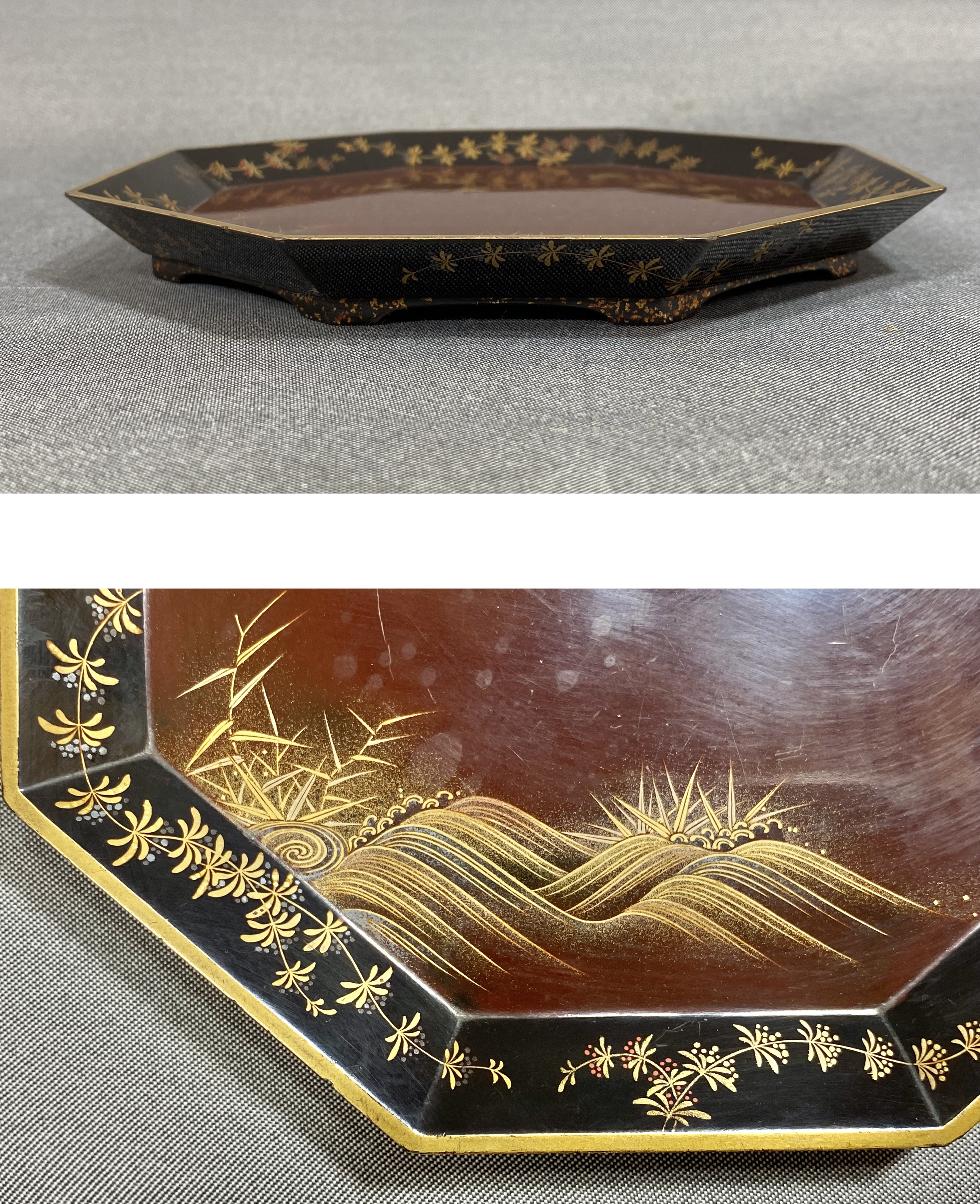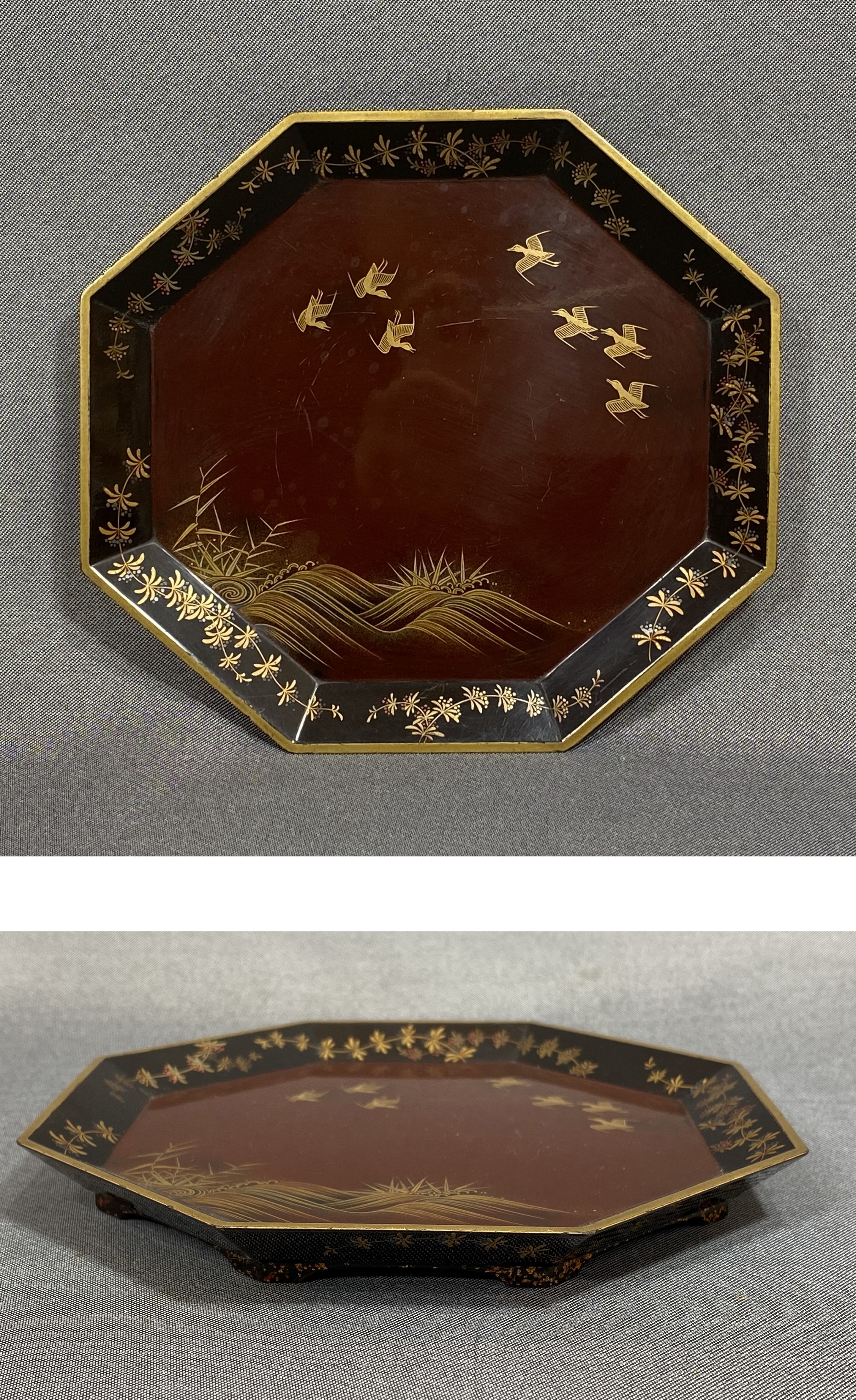 【風車】時代 蒔絵 波千鳥 金彩 梨子地 唐草文 八角 茶盆 木器 ▲アンティーク 時代物 漆器 古民具 收藏