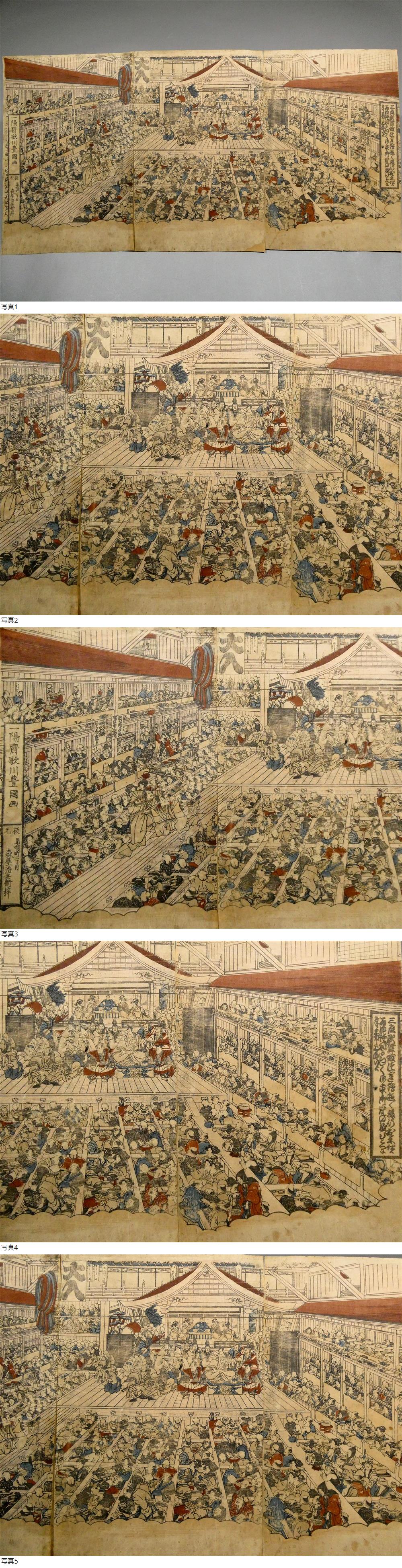 ■ 初代 歌川豊国 江戸時代 木版浮世絵 「中村座内外の図」3枚続揃い 大入! 正月 曽我狂言の対面の場 ■