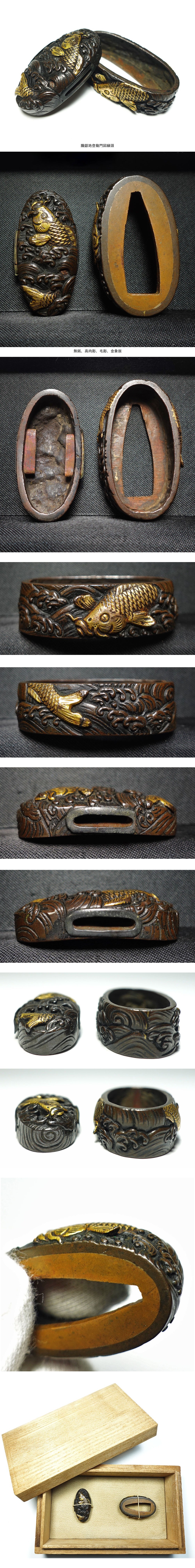 ★大森波の如し 朧銀地登龍門図縁頭 無銘 高肉彫 毛彫 金象嵌 鯉の滝登り 登竜門 立身出世 刀装具 拵 外装 桐箱入 收藏