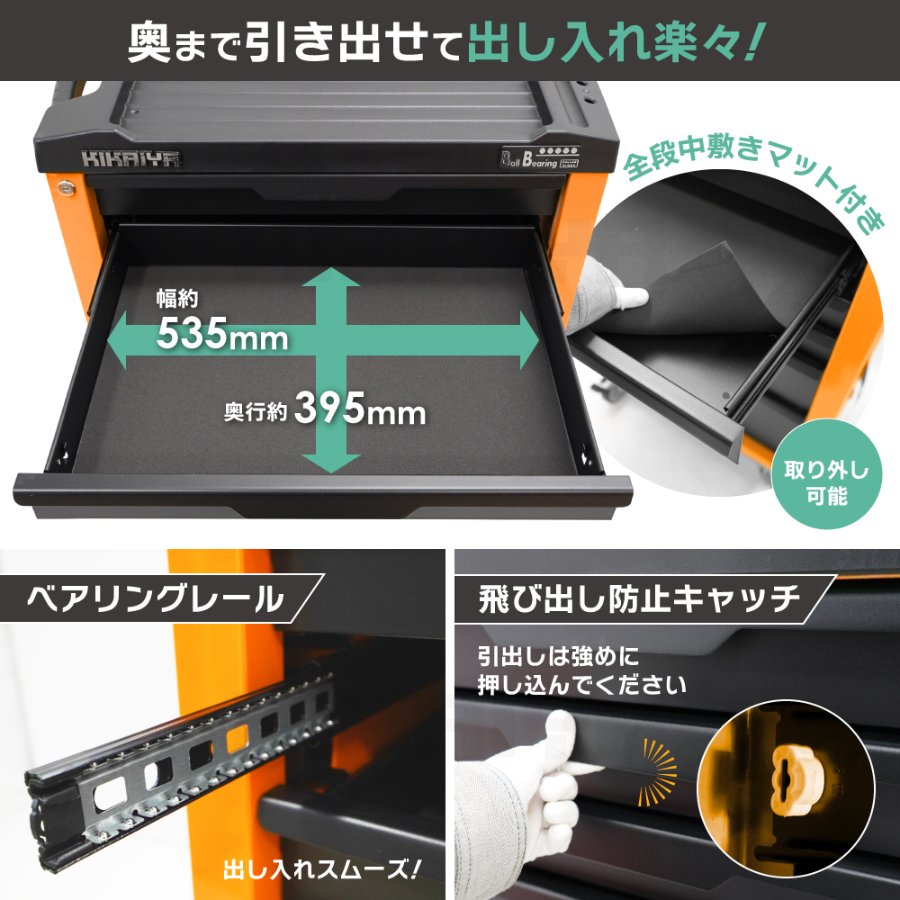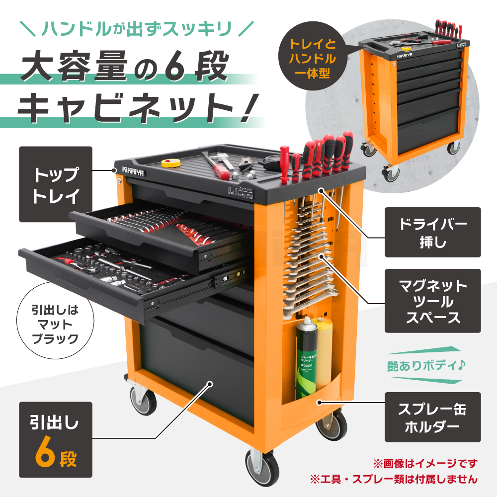 3つのサイズの引出しで使い勝手抜群! 大容量のトップトレイ、マグネットツールスペースあり ●メカニックやDIYなど、整備工具や修理道具の整理整頓に! ●艶ありボディとマットブラックの引出しが目を引く、 ツートンカラーのローラーキャビネット ●引出しは小傷が目立ちにくい艶なしタイプで、全段に中敷きマットが付いています ●引出しは全てベアリングレールを使用し、スムーズに動きます 引出しを押し込む事で軽くキャッチになり、飛び出し防止になります ●キャビネットはカギを閉めると引出しが全段ロックされます(※カギは共通です) ●トップトレイには工具を整理しやすい凹凸があり、 ドライバーなどを差す穴もあります ●ハンドルはトップトレイと一体型で邪魔になりません ●キャビネット側面はマグネットツールを設置してもスッキリ収納できます |