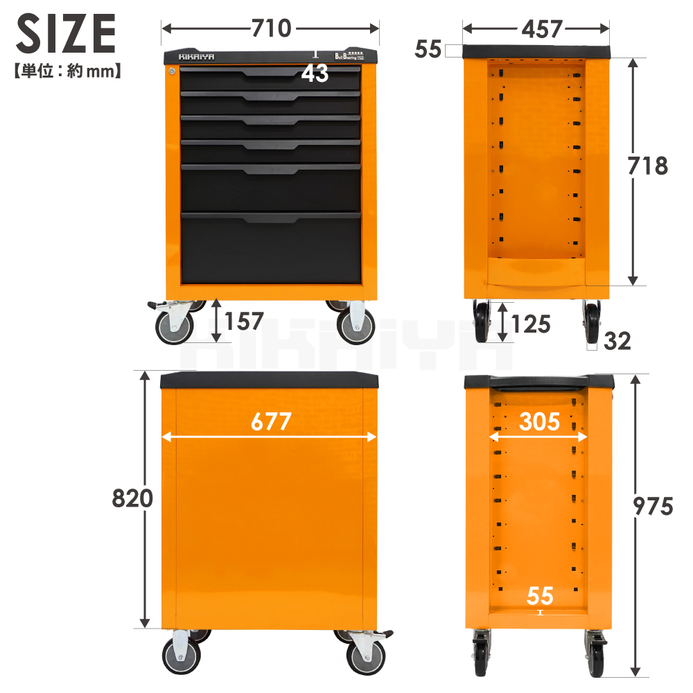 | 最大荷重(静止時) | 合計最大荷重:約140kg トップトレイ:約30kg 引出し1~4段:約15kg 引出し5段:約25kg 引出し6段:約35kg |