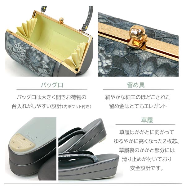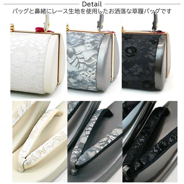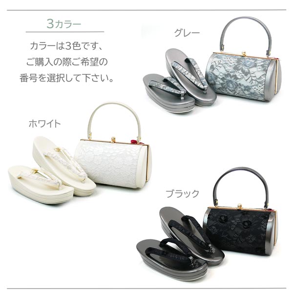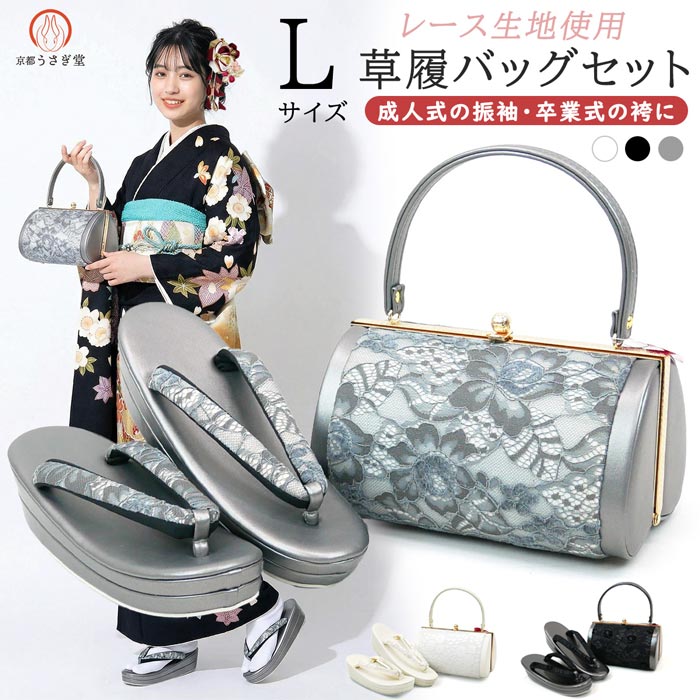 Lサイズ 振袖用 厚底 草履バッグセット zb-089 レース 帯地 白 ホワイト 黒 ブラック 灰色 グレー 振袖 成人式 フォーマル 收藏