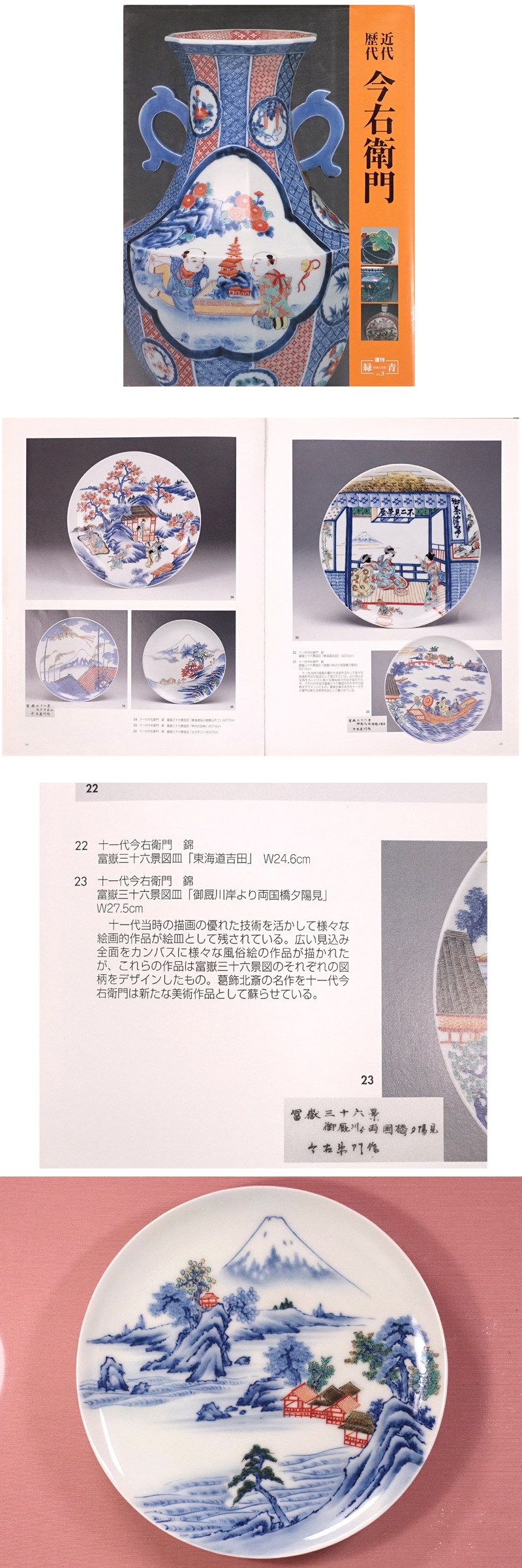 ご覧の通り同手作品が今右衛門作品集に掲載された希少性高き絵皿です!11代は画工としての優れた腕前を活かして様々な絵画的作品を絵皿として残しており、葛飾北斎を代表する名作「富嶽三十六景」からそれぞれの図柄を色絵にてデザインし、江戸の記憶が薄れゆく時代に新たな美術作品として蘇らせました。(※相州七里浜は掲載されておりませんが、同シリーズのお品として同手品と表現しています。)