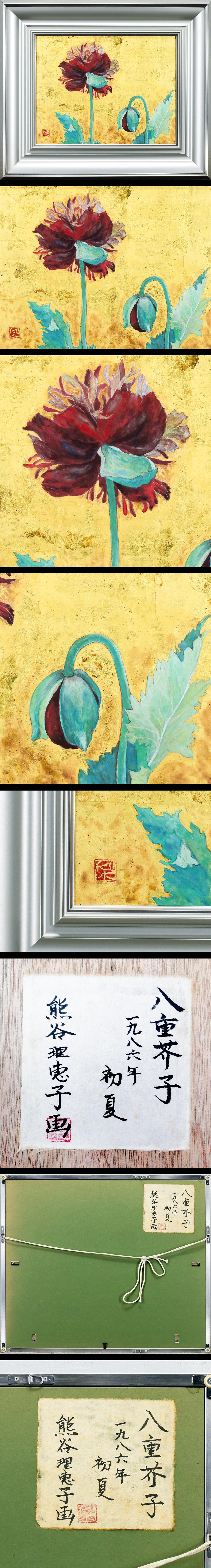 【真作】【WISH】熊谷理恵子「八重芥子」日本画 6号 1986年作 金泥仕様 金箔仕様 共シール ◆金地に咲く深紅の花 #26023046 收藏