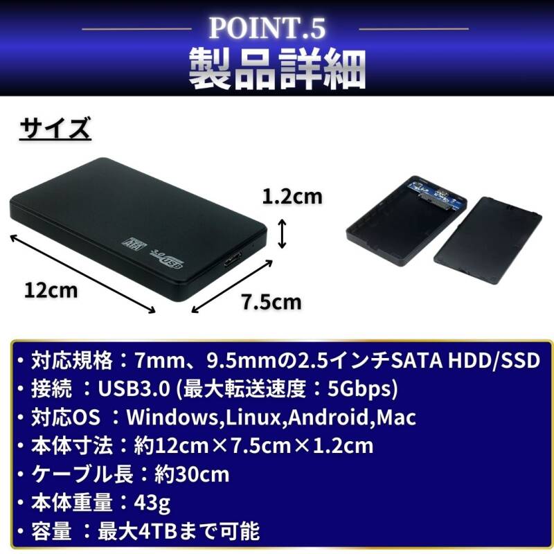 【商品仕様】 ・対応規格:2.5インチ SATA HDD/SSD(7mm・9.5mm厚対応) ・転送速度:最大5Gbps(USB3.0接続時) ・対応OS:Windows7/8/10/11、Mac OS、Linux、Android ・サイズ:約12cm × 7.5cm × 1.2cm ・ケーブル長:約30cm ・容量:最大4TBまで対応 ・カラー:ブラック ・素材:ABS樹脂 ・数量:2個セット 【セット内容】 ・HDD/SSDケース ×2 ・USB3.0ケーブル ×2 ・合皮保護ケース ×2 |