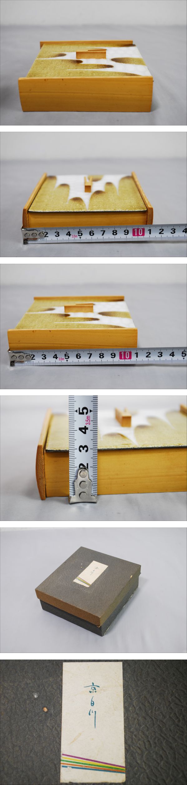 | 商品: 京白川 七宝焼き 竹製 四角箱 蓋付き サイズ: 画像をご参考下さい。 重量: 約213g 家庭用はかりですので誤差はあります。 ※商品詳細はわかりません。 目立つ傷等は無いように思います。箱はかなり傷んでます。 画像のものだけです。 「ノークレーム・ノーリターン」を納得された上でのご入札をお願いいたします。 送料は下記に送料表がございますのでご参考下さい。 ※長期保管、経年劣化がある場合もありますので、よく画像にてご判断お願い致します。ご理解いただける方のみ入札お願い致します。 | ||