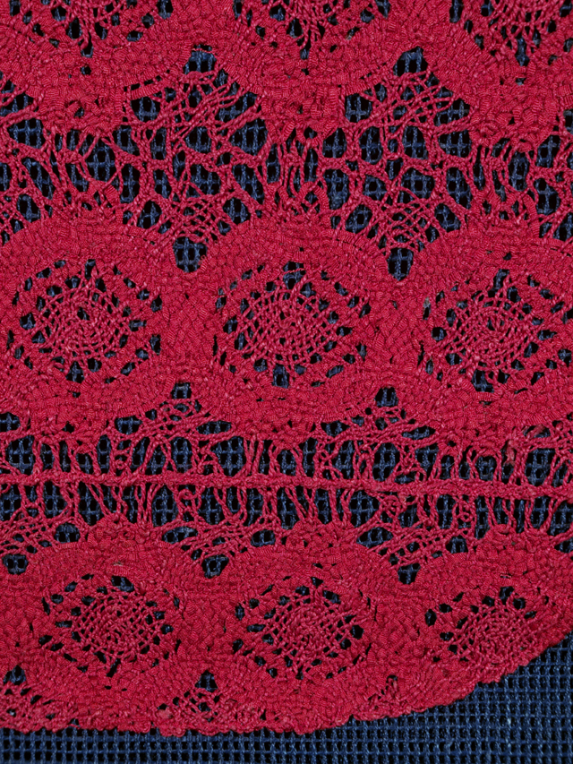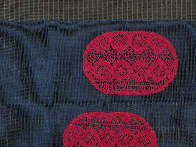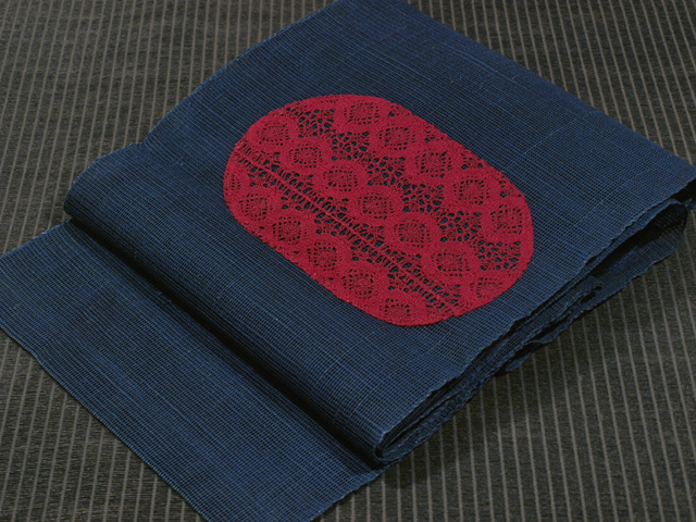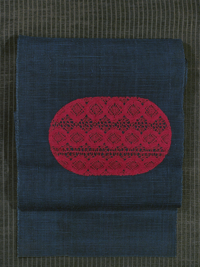 深縹(こきはなだ)色の地に、抽象的な花の配された紅赤色の長丸の文様が織り込まれている、紗の八寸名古屋帯です。 長丸文様部分はレースで編まれたものが施されていて、めずらしさが感じられます。渋みのある小粋さが感じられる意匠です。 ユーズド品で、画像のとおり、前の折り跡があり、その部分がうっすらと褪色気味です。また、へりなど全体のところどころにこまかな褪色がちらほらとありますが、あまり気にはなりません。そのほかに目につく大きなしみやよごれ、褪色などのダメージは見あたりません。 |