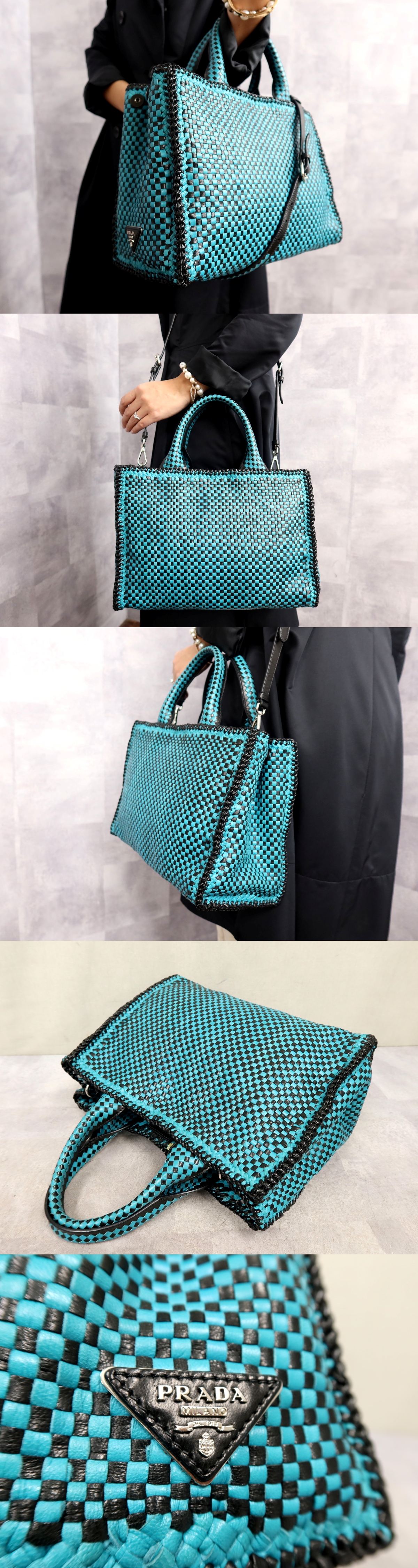 超美品●PRADA プラダ●マドラス●オールレザー●カーフ レザー 本革●2way ハンド バッグ●ターコイズブルー 黒●イタリア製●B5●Js62638 收藏