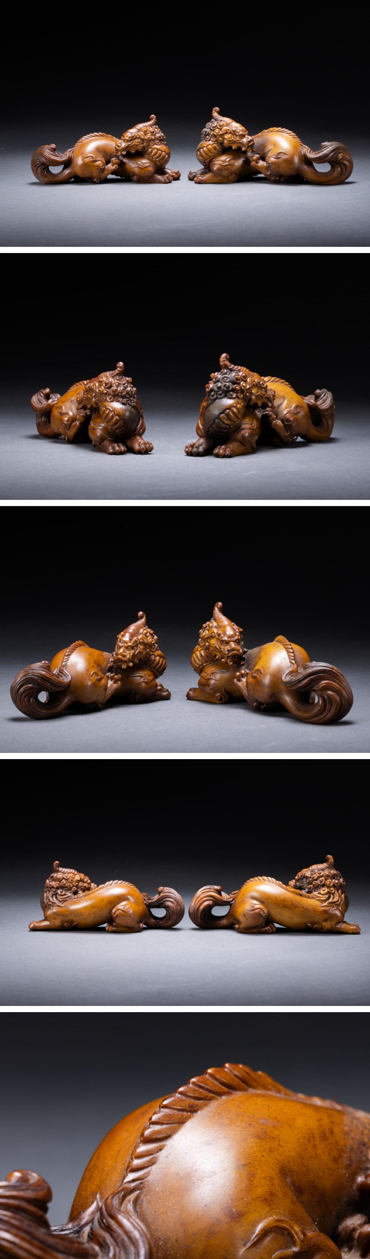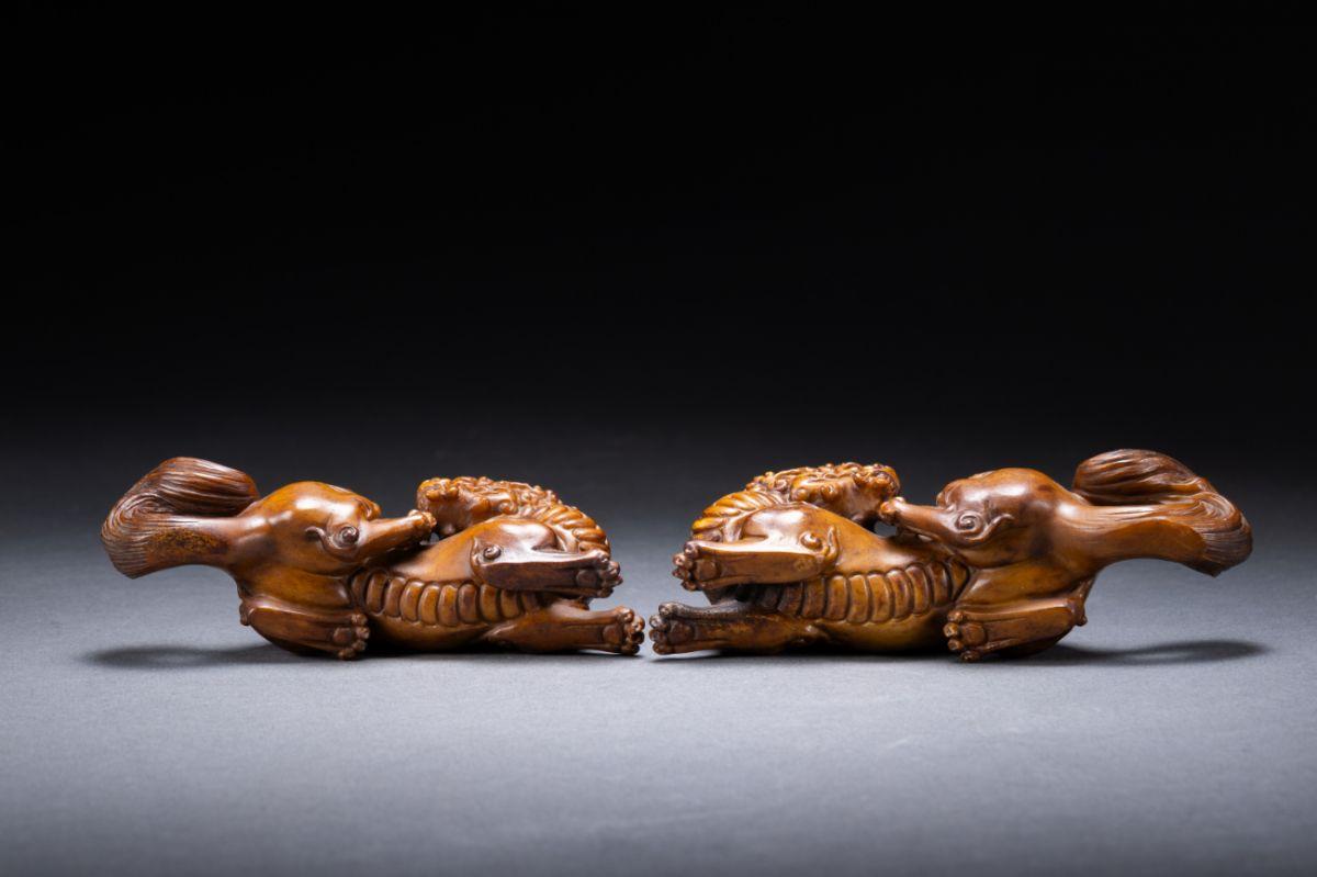 【清】関西某オークション購入 時代物 鹿角彫 瑞獣紋根付一双 極細工 古置物 古擺件 古美術7L11-102S5