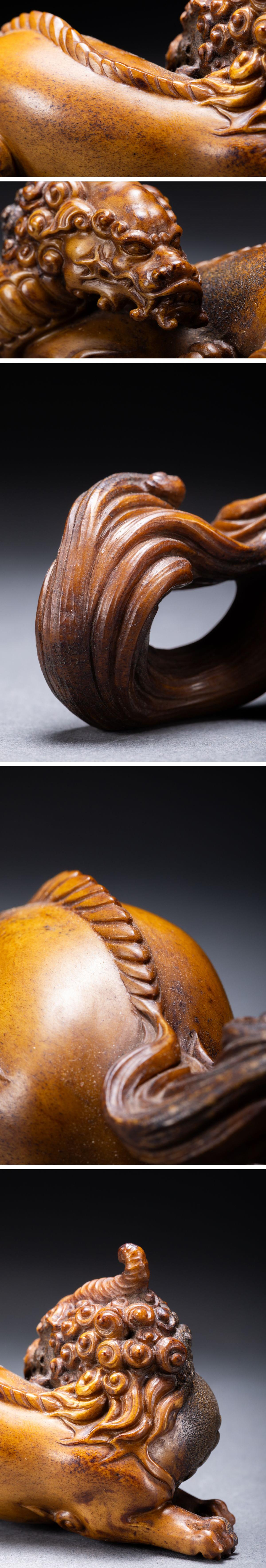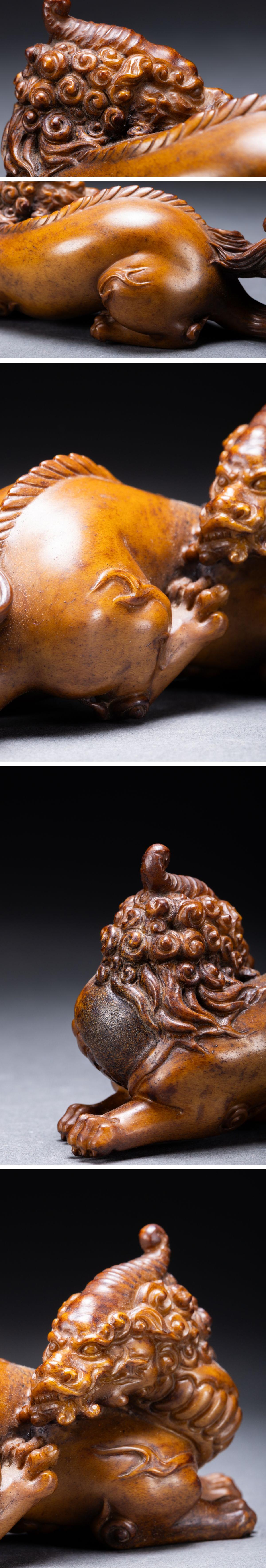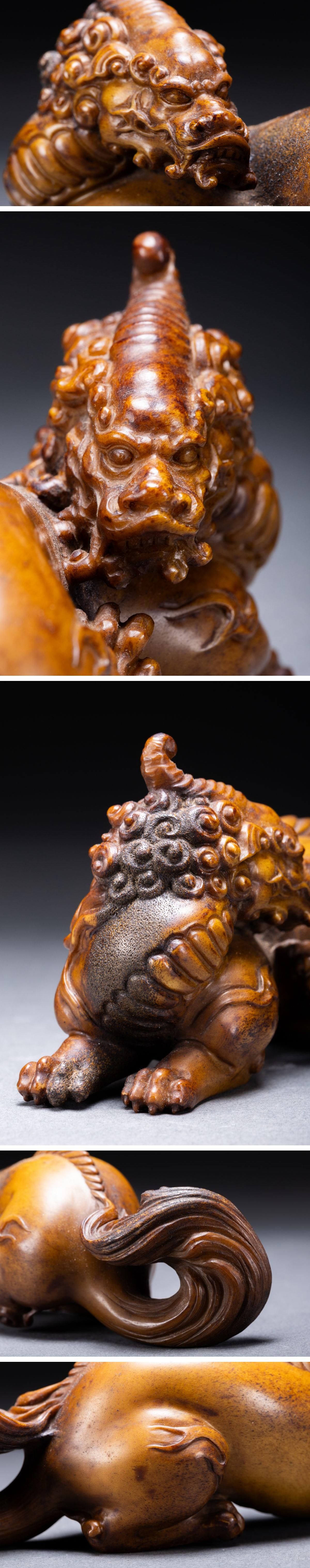 【清】関西某オークション購入 時代物 鹿角彫 瑞獣紋根付一双 極細工 古置物 古擺件 古美術7L11-102S5 收藏