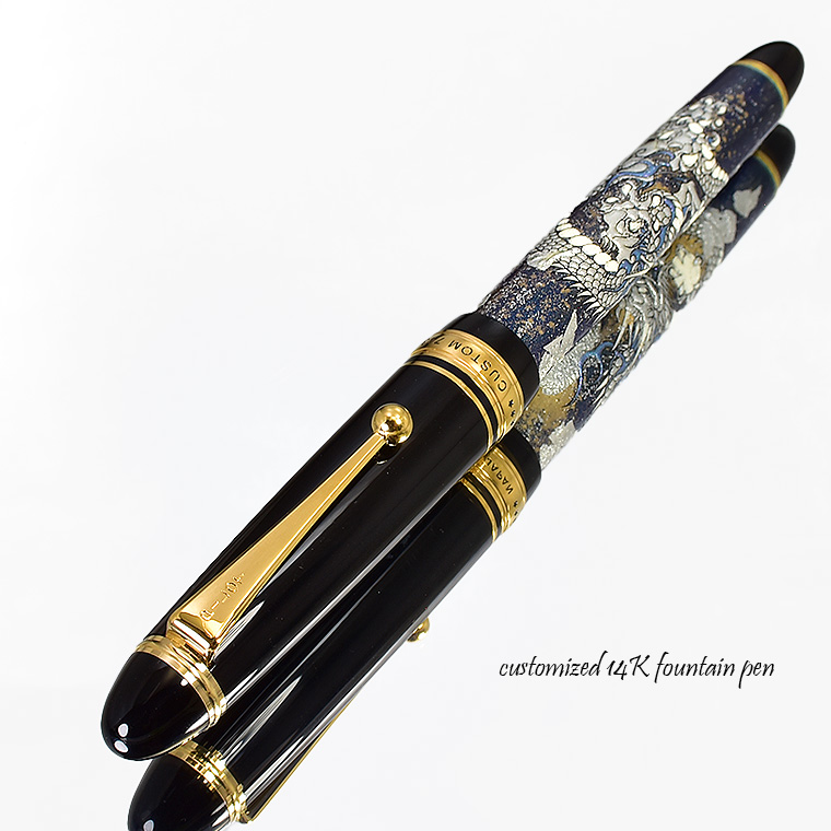 カスタム 743に銀箔・金粉・ラメ装飾と漆塗りを施した 限定1本! ハンドメイド作品 ”銀龍ドラゴン” 14金ペン先 M(中字) プッシュ式コンバーター付属 ![]() 今回ご紹介するのは、黒軸の万年筆に紺色の漆を塗り、シルバードラゴンをデザインし、 銀箔・金粉・ラメ装飾の蒔絵調装飾を施し、さらに上から漆塗りを重ねた、” ハンドメイドカスタマイズ商品”です。 国産メーカーのカスタム743をベースに”銀龍”をデザインしてみました。 ![]() 迫力ある銀龍が舞う見事な1本 ドラゴンは東洋では縁起の良い生き物として、西洋では力強く神秘的な生き物として、 古くから人々の想像力を刺激してきました。 ドラゴン絵柄万年筆は、デザインや品質だけでなく、ドラゴンの象徴性も楽しめる 万年筆です。ぜひ一度お試しください。 ![]() 万年筆のボディ軸には銀龍デザインに豪華絢爛な銀箔・金粉・キラキラ広がるラメ装飾、 最終仕上げは漆塗りです。 ボディにラメも閉じ込めることで、より銀龍が夜空に浮かび上がるデザインとなり、 ペンが光を受けると、キラキラ煌めき、美しさを漂わせます。 さながら幻想的な雰囲気に、ペンそのものをより魅力的に輝かせ、 時間を忘れていつまでも筆記していたくなるような気持ちにさせてくれる1本かと思います。 ![]() 日本メーカーの万年筆の有名シリーズ、カスタム743をベースにしてますので、 品質は折り紙付きです! ペン先はM(中字)をご用意しました! カジュアルなフォルムでシンプルなデザイン、そして書き心地の良いペン先。 ステンレスペン先とはひと味違う14Kペン先の万年筆の「書き心地」を体感頂けるはずです。 ![]() そしてこの万年筆のもう一つの魅力が 「プッシュ式コンバーター」 によるインクの補充です。 普通のコンバーターは回転式ですが、 今回はプッシュ式なのです。 ペン先をインク部分にまっすぐ浸けます。 ノック部分を5.6回を押せば、コンバーターがゴクゴクとインクを飲みこんでくれる ように吸引するのです。なかなかのスグレモノです。 そしてこの機構が威力を発揮するのがボトルのインクが少なくなった時です。 ボトルの底に少ししかないインクを吸い上げるのは、かなり大変です。 このプッシュ式なら片手でプッシュするだけなので、楽々吸入することができるのです。 技ありの一本なのです! 純正カートリッジもお付けして、専用ケースに入れてお届けしますので、 ギフトにも大変喜ばれます。 ![]() 特別仕様のカスタマイズ商品ですので、何か不具合が生じた場合は、 当店にて責任を持ちまして対応させていただきますので、ご安心ください。 こちらの万年筆に興味を持っていただける皆さまの入札を心よりお待ちしております。 どうぞよろしくお願いいたします。 ![]() ************************************************************* ≪商品詳細≫限定 カスタマイズ万年筆 カスタム 743 14金 M(中字)蒔絵調 銀箔・金粉・ラメ箔装飾 漆塗り万年筆 ”銀龍” ペン先 : 14金 サイズ : M(中字) 機構 : カートリッジ・コンバーター両用式 長さ : 149mm 太さ : 15.7mm(最大軸径) 重さ : 26g 付属品 : 純正ケース・インクカートリッジ1本・説明書 プッシュ式コンバーター内蔵 本体価格 : ベースのカスタム743万年筆定価→45,000円(税込49,500円) 新品未使用 日本製(*漆は工芸漆となります) *お使いのモニター、撮影条件などの理由で実際の商品と若干色合いが異なる場合が ございます。 ※新品未使用ですが、加工時に軸以外の金属部分にも漆がついて しまった箇所がある場合がございます。 また下地の黒色部分にも漆の僅かなはみ出しがある場合がございます。 ハンドメイド作品として予めご了承の上、ご入札をお願いいたします。 ハンドメイド商品となりますので 品質には十分注意して取り扱っておりますが、カスタマイズ商品 ハンドメイド作品としてご理解下さいますようお願い致します。 ************************************************************* |