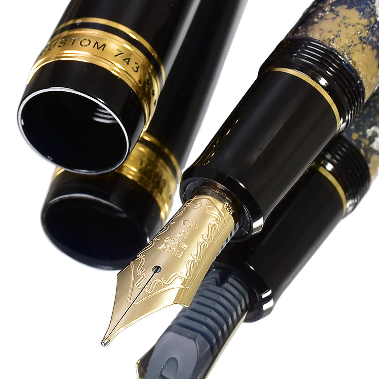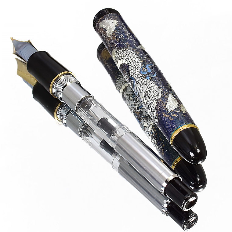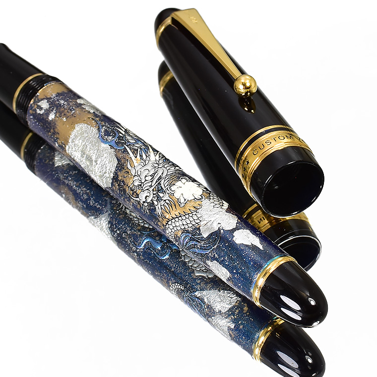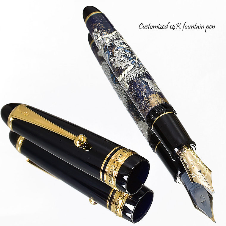 ■●カスタマイズ万年筆 特別仕様 14金 カスタム743 蒔絵調 銀箔・金粉・ラメ装飾 紺色 漆塗り 銀龍 ドラゴン 黒軸 M 中字 新品 限定/M708c 收藏