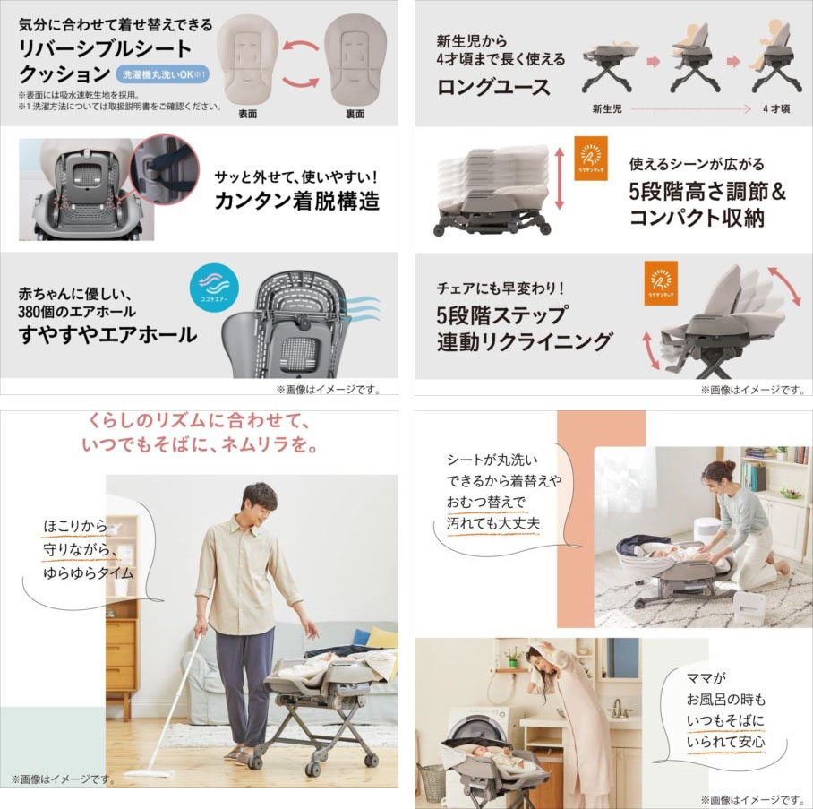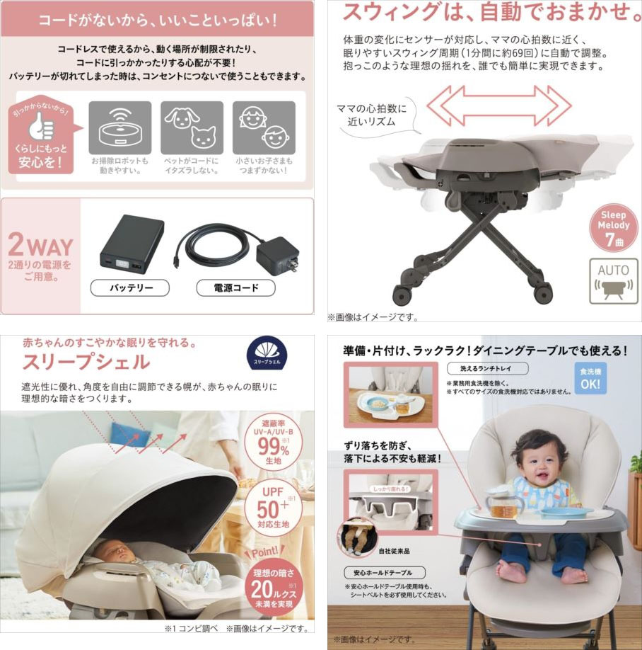 【商品特長】 ●コードレス:専用のバッテリーを搭載し、コンセントのない場所でもオートスウィング使用が可能に! 動く場所が制限されたり、コードに引っ掛かったりする心配が不要! バッテリーが切れてしまった時はコンセントにつないで使うこともできる2way仕様。 ●オートスウィング:ママの心拍数に近いスウィング周期の揺れと、体重の変化にセンサーが対応し、揺れを一定に保ちます。 ※スウィング機能(電動・手動)を使用する場合の荷重制限は、8kg(お子様の衣服などを含む)までとなります。 ●スリープシェル:遮光性に優れ、角度を自由に調節できる幌が、赤ちゃんの眠りに理想的な暗さ(20ルクス未満)をつくります。 ●新生児から4歳頃までロングユース!寝かしつけのベッドからお食事の時のハイチェアまで、 赤ちゃんの成長に合わせて幅広いシーンで活躍します。 ●洗えるランチトレイ:ベビーラックだけではなく、そのままダイニングテーブルでも使えるトレイができました。 食洗器もOK!でお手入れもラクラクです。 ●安心ホールドテーブル:赤ちゃんのからだを支えるテーブルが、ずり落ちを防ぐので、お食事の時も安心です。 ●すやすやエアホール:380個もの通気口が空いた構造で、体温調節が苦手な赤ちゃんも快適です。 ●リバーシブルシートクッション:気分に合わせてデザインチェンジできるリバーシブル仕様。 表面は吸水速乾生地を使用しているので赤ちゃんも快適。 | |||||||||||||
