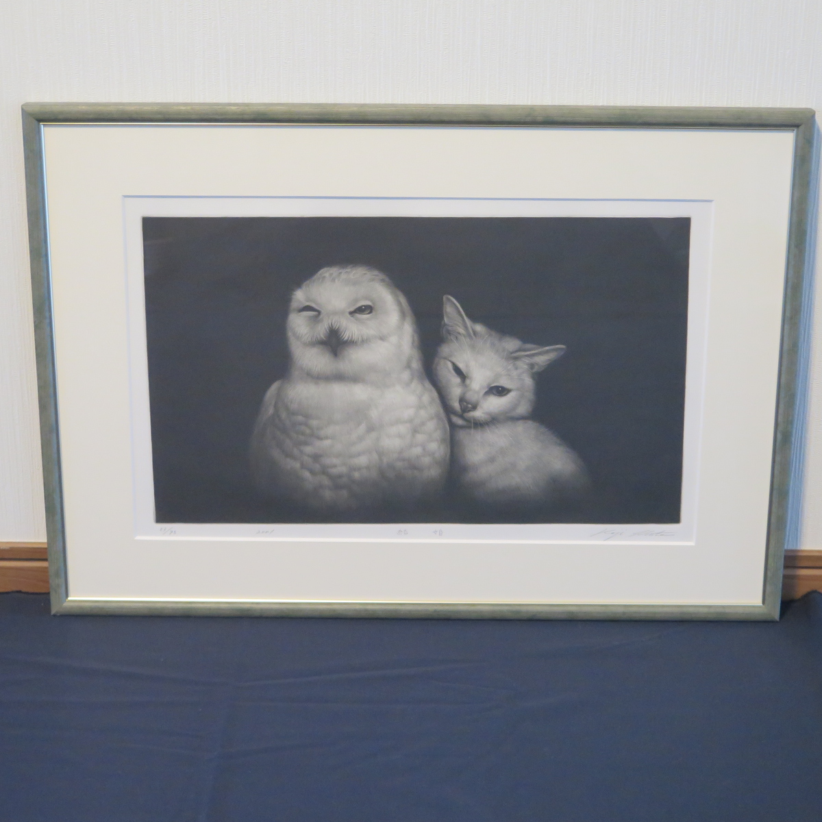 大型作品、タイトルは【 結婚 】イケメン白梟の旦那さんにかわいい白猫のお嫁さん、穏やかで素敵な光景です。個展に於いて作家本人からの購入です。メゾチント。画面36.9*28.0㎝(5~6号大)。画面にサイン、エンボス、タイトル、限定エディション53/95、年記2001。シートサイズ55.5*37.6㎝(フルマージン)。状態は良好です。額装サイズ65.5*46.5*2.3㎝。