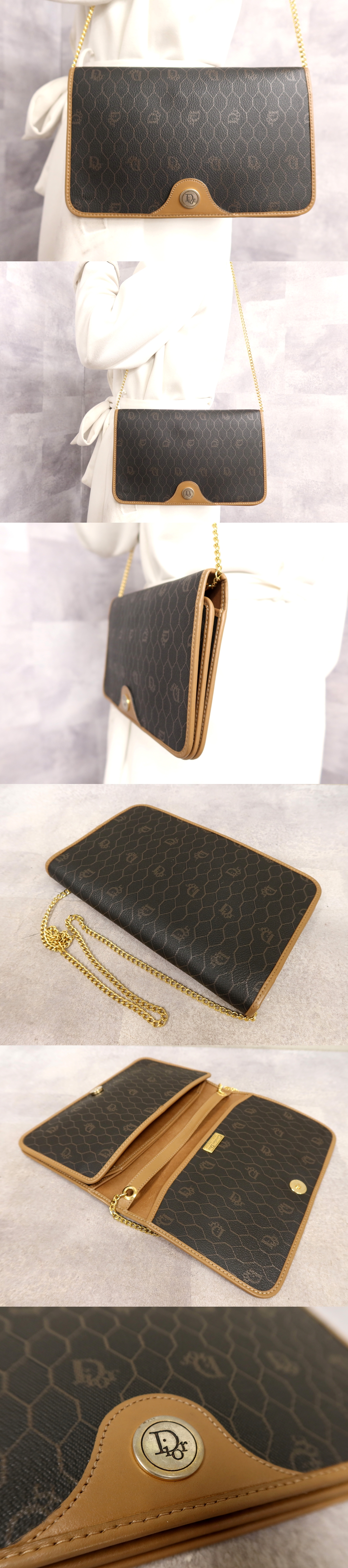●超美品●クリスチャン・ディオール●ハニカム柄●PVC カーフ レザー●チェーン ショルダー バッグ●キャメル 黒●ヴィンテージ●Js65480 收藏