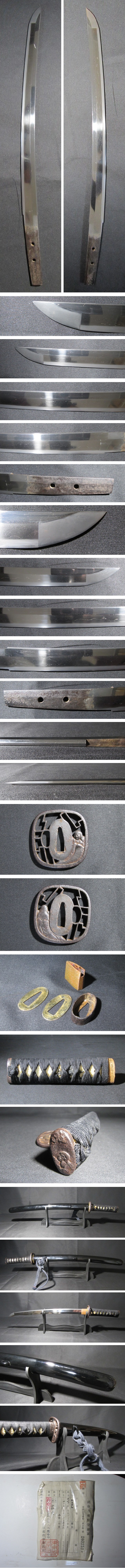 種類:短刀 銘:家次 登録:東京203253 鑑定書:なし 刃長37㎝ 全長48.8㎝ 元幅2.6㎝ 元重0.5㎝ 先幅2.1㎝ 先重0.4㎝ 外装全長57.5㎝ (多少の差はお許しください) 状態 出品前に検品を致しましたが、疵やヒビ・直しは見られません。 骨董品という事をご勘案頂き、時代経過のスレや、窯疵、小さな傷がある場合があるかもしれませんのでご承知置きください。 画像をご覧いただき、気になる箇所がありましたら「質問欄」よりお問い合わせください。 | |||
