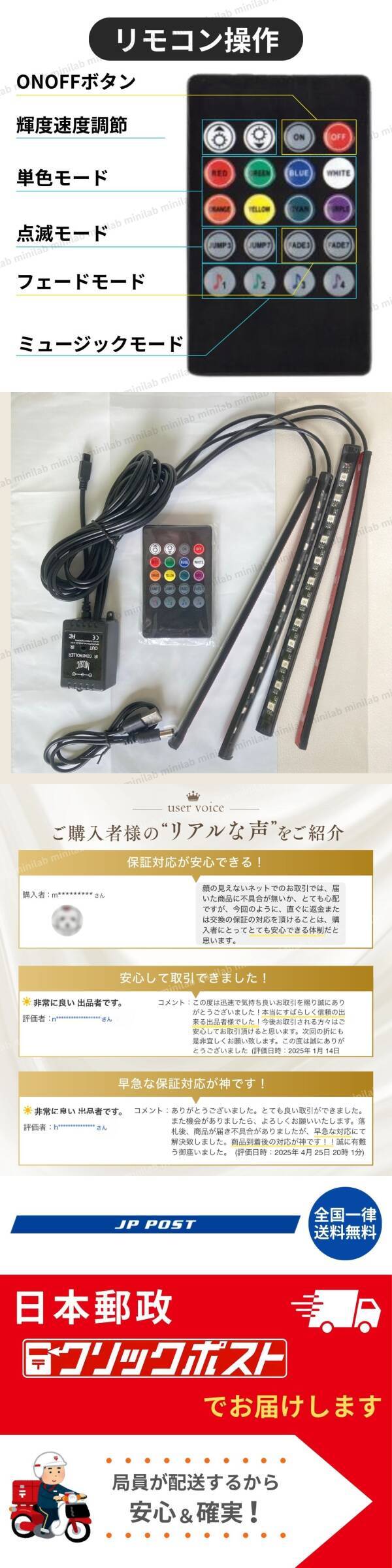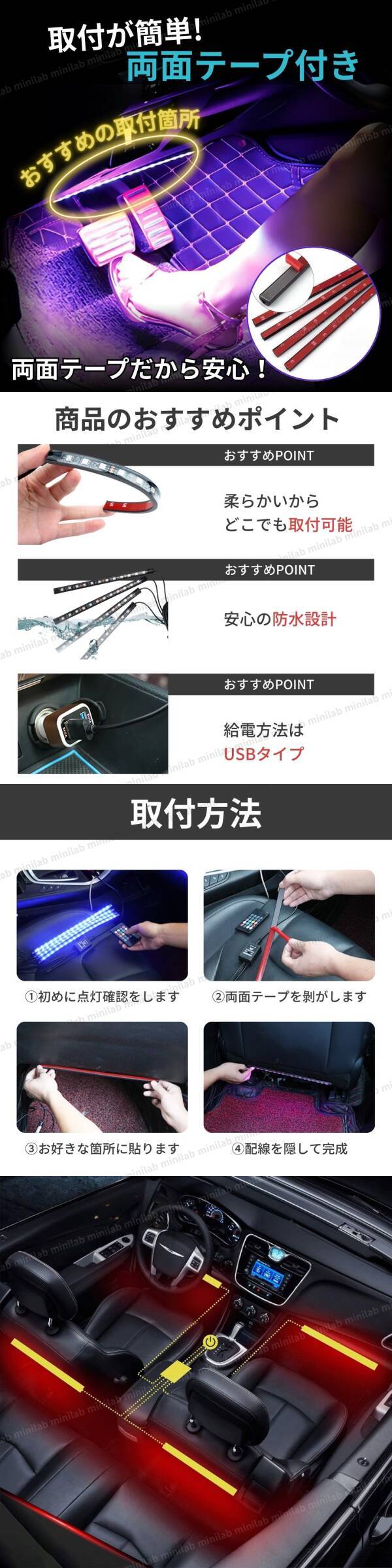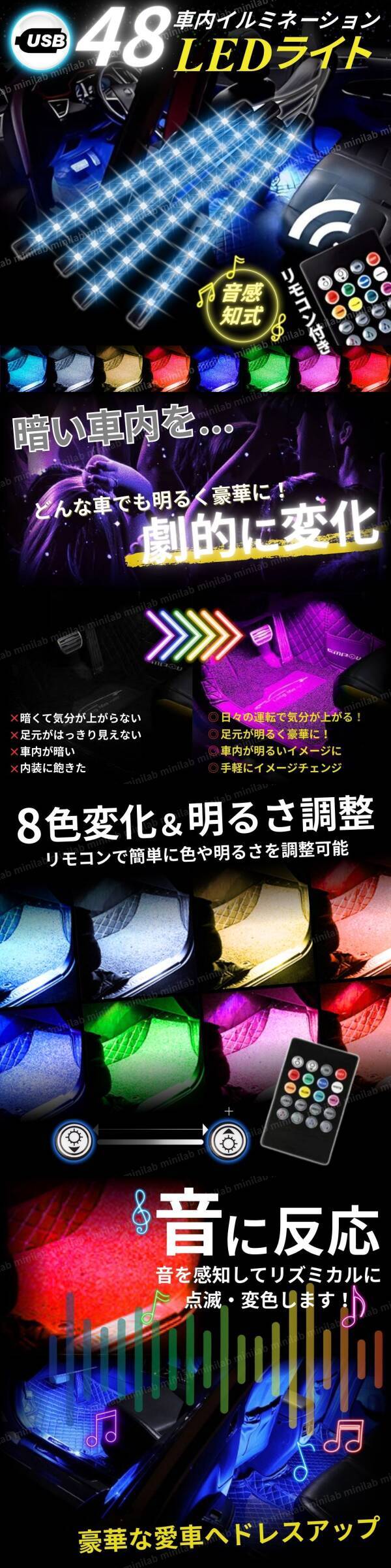 LED テープライト 車用 間接照明 12V USB イルミネーション フットライト 装飾 リモコン 操作 ドレスアップ RGB ルームライト フロアライト 收藏