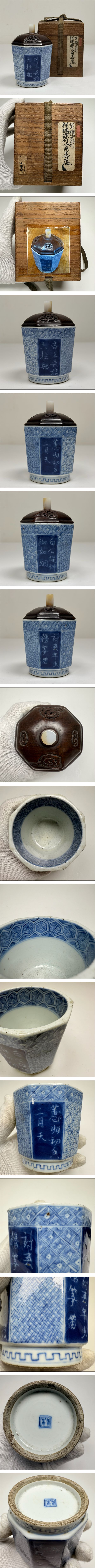 XMF-中国古美術 時代物 染付 香炉 香道具 八角 在銘 紫檀蓋付 祥瑞図 共箱付 唐物 陶磁器 中国古玩 骨董品 古董 收藏