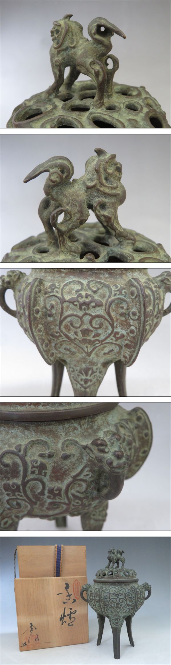 ◆◇秀保 造 鋳銅蝋型 三足香炉 唐草紋 獅子摘蓋 高さ/16.5cm 重量/723.6g 香道具 銘無し 高岡銅器 共箱付◇◆ 收藏