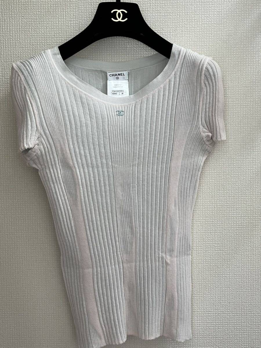 本物 極美品 シャネル COCO装飾 リボン付き 半袖 リブニット セーター 3