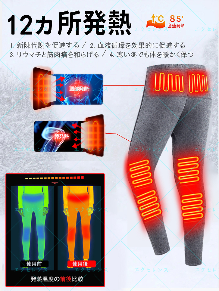 | 商品説明 | 材質】:ポリエステル、綿 【カラー】:ブラック,グレー 【3つの独立した温度設定&3段階温度調整】好みや使用シーンに合わせ、3段階温度調整可能で、スイッチを3秒長押すごとに高温(約45-55℃)→中温(約35-45℃)→低温(約30-35℃)を簡単に切り替えできます。バッテリーに接続すれば、いつでも暖かさを楽しむことができます。ヒーターパンツはスイッチを3秒長押すだけで①腹部ヒーター2つ②ウエストヒーター2つ③膝ヒーター8つを設定できます。 【高品質電熱パンツ&10秒急速加熱】2024年最新の電熱パンツはすぐに暖かくなり、冬の間寒さを心配する必要はもうありません。 また、従来の電熱線よりも熱効率が良く、使用時間は3倍近く長くなります。ハイテク炭素繊維加熱技術を採用し、加熱効果が高く、利用率が高く、10秒で急速加熱します。 長押しすると3~5秒以内に電源が切れ、使いやすく操作も簡単です。 同時に、お尻、ふくらはぎ、膝を温め、血行を促進し、抵抗力を高め、疲労を和らげます。 【長時間続航&水洗い可能な電気ベスト】技術改良後の電気ベストは、速暖など利点が持っている以外、エコがもう一つ利点です。汚れたら、バッテリーを外して、電熱ベストが水で丸洗い可能、洗濯機に入れて洗うこともでき、いつも清潔に保ちます。(※ご注意:①5V/2A-2.1AのUSB出力充電式モバイルバッテリーを使ってください。②必ずバッテリーを外し、USBケーブルをポケットに入れ、ポケットのファスナーを閉め、余熱がない状態で洗ってください。) |